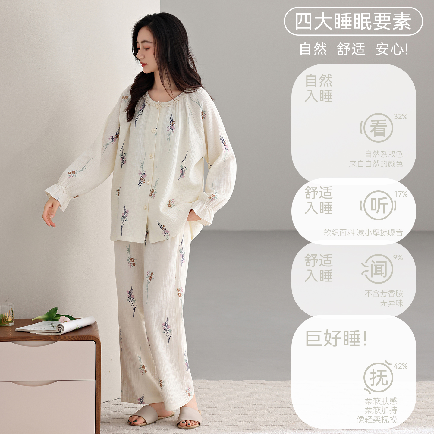 长袖 简约舒适家居服套装 长裤 夏季 可外穿 2025新款 纯棉睡衣女春秋季
