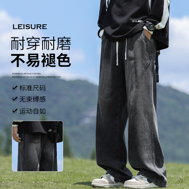 子 男秋潮牌青少年水洗宽松直筒裤 V37美式 侧边织带条纹拼接牛仔裤