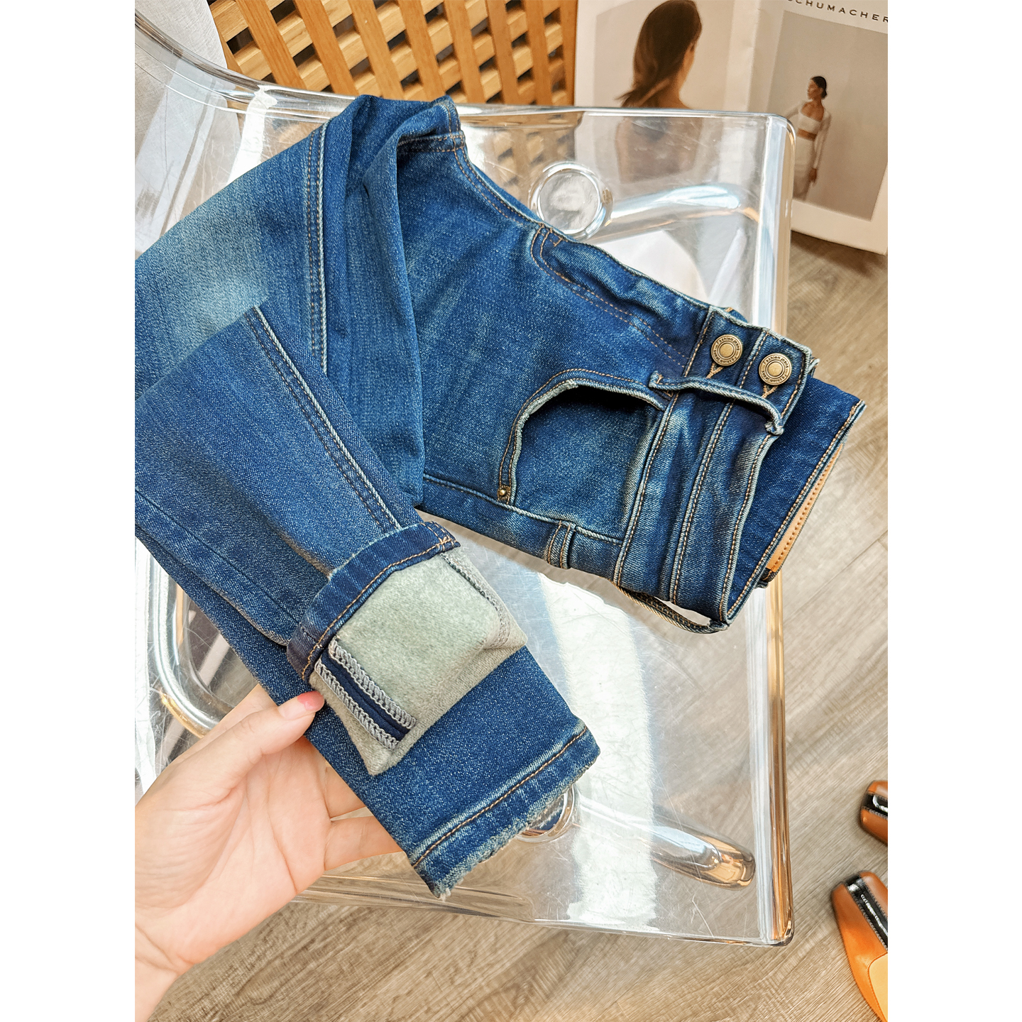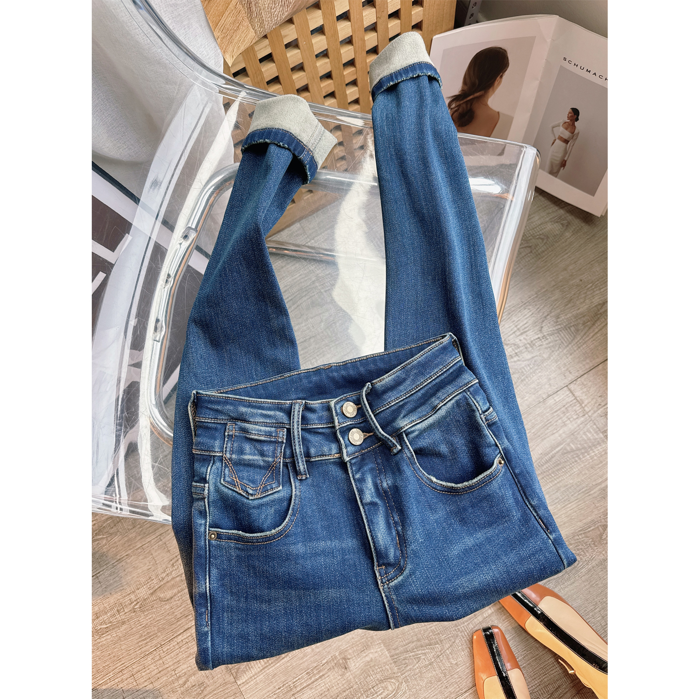 靴裤 薄绒高腰显瘦小个子铅笔小脚裤 子 女冬季 深蓝色加绒紧身牛仔裤