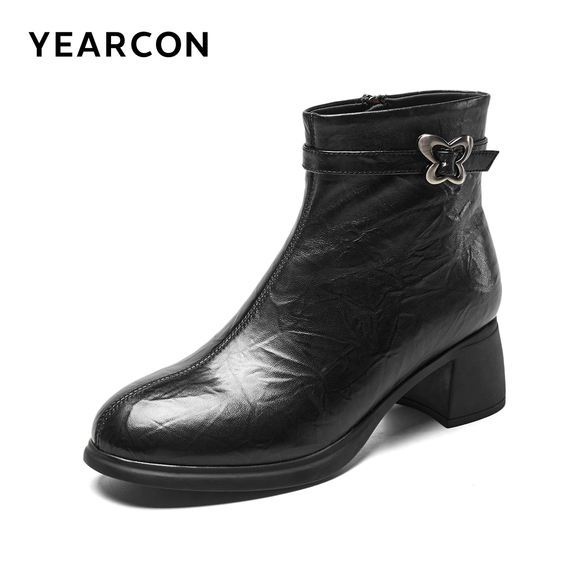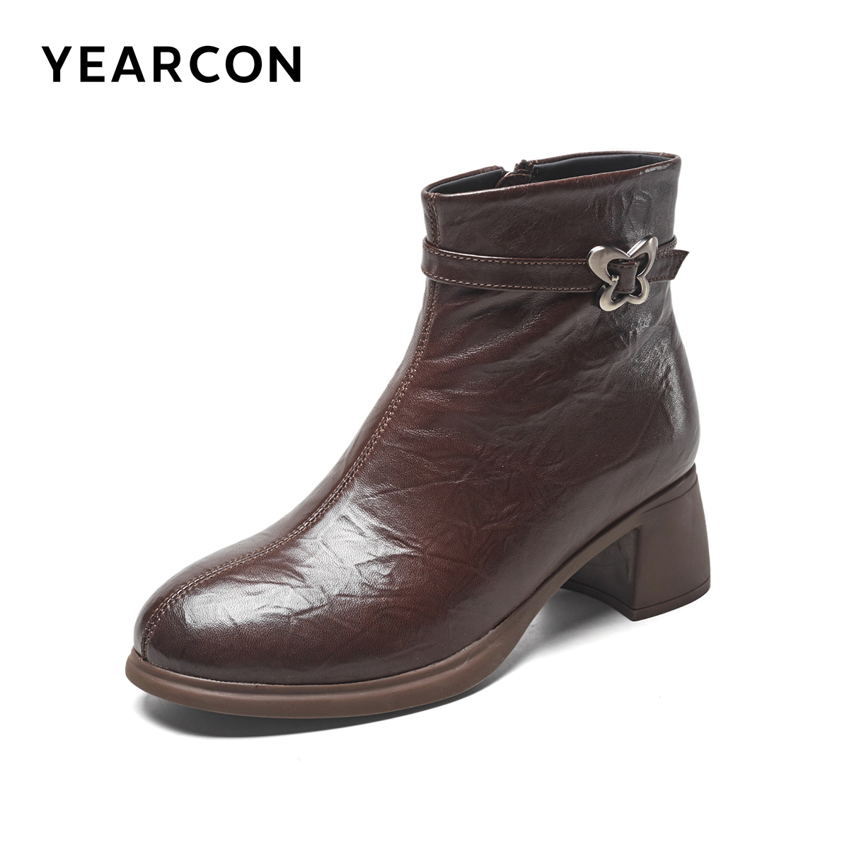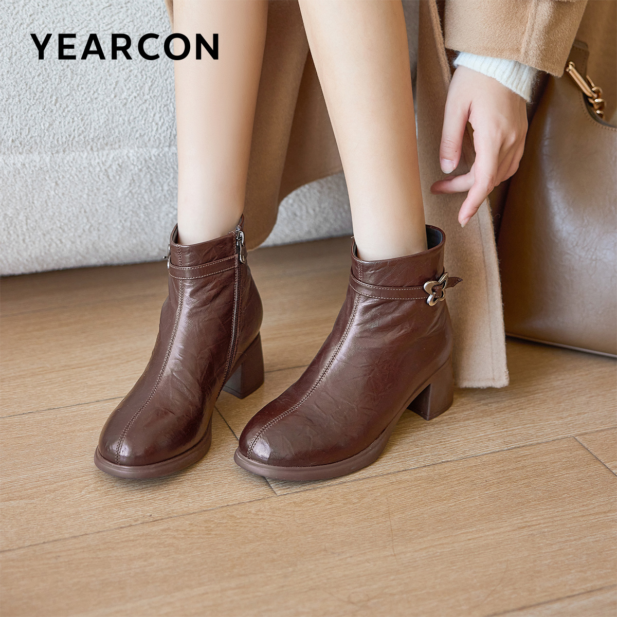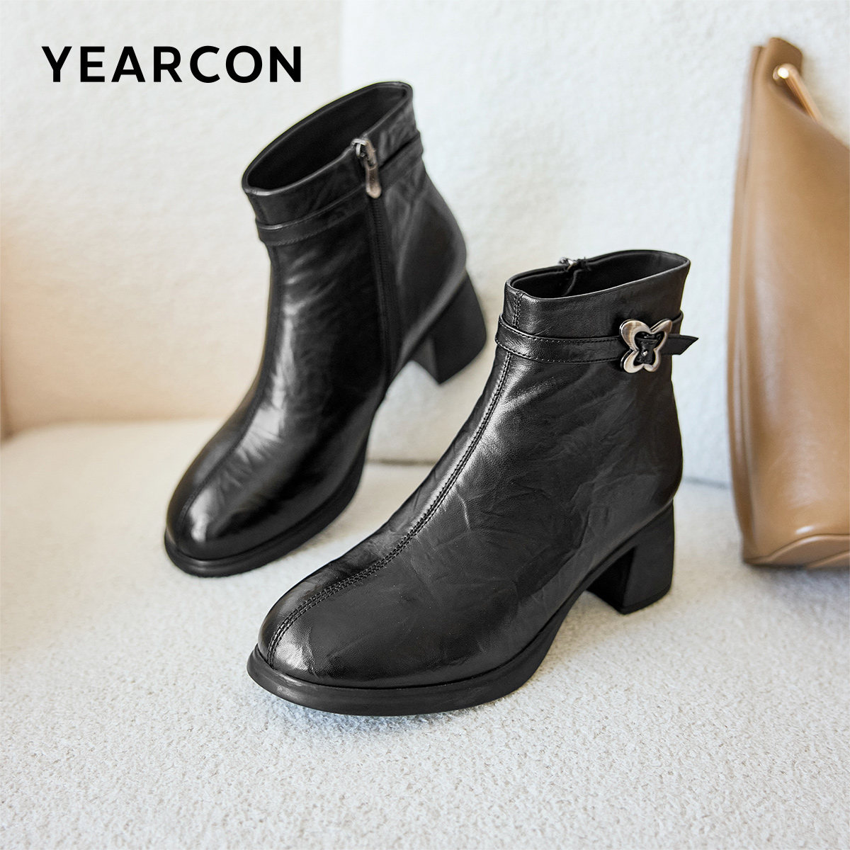 短筒靴 真皮短靴女加绒粗跟靴子高跟时装 意尔康女靴2025新款 秋冬季