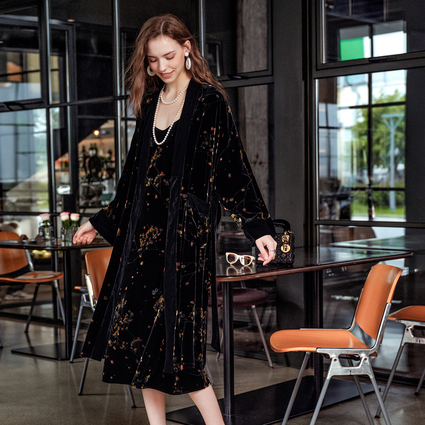 美标秋冬新款 金丝绒烧花吊带睡裙睡袍两件套女真丝桑蚕丝绸家居服