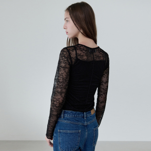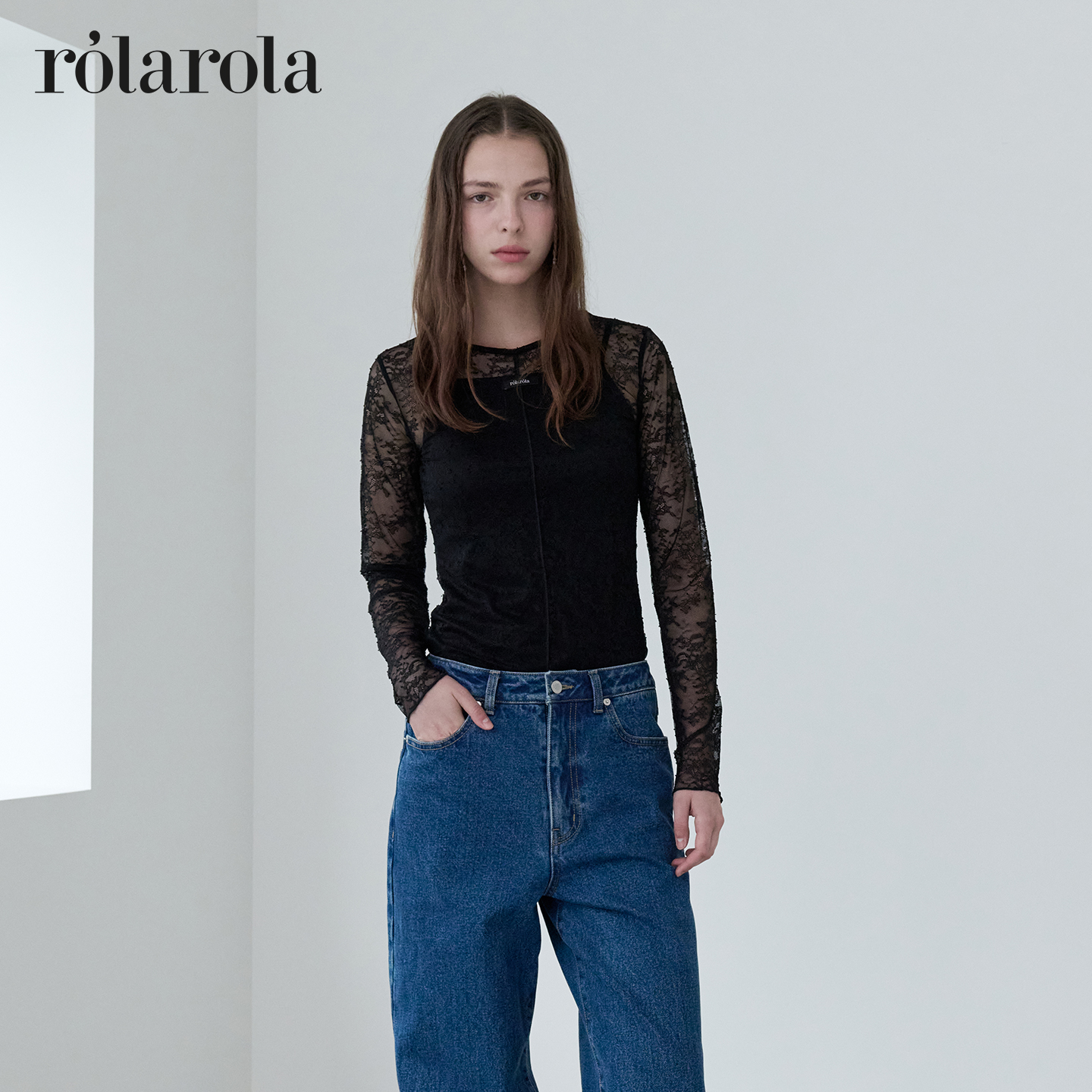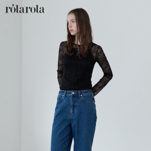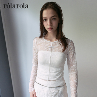 显瘦打底衫 ROLAROLA25年秋季 T恤女修身 蕾丝镂空长袖 上衣叠穿 新款