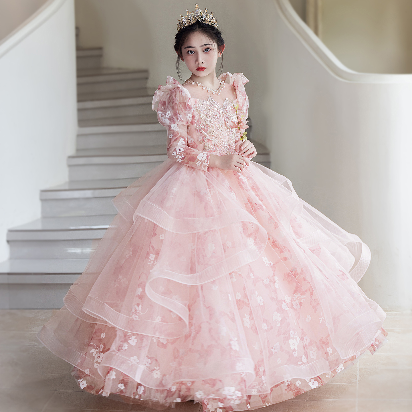女童晚礼服粉色高端儿童生日公主裙女孩主持人钢琴演奏演出服长袖
