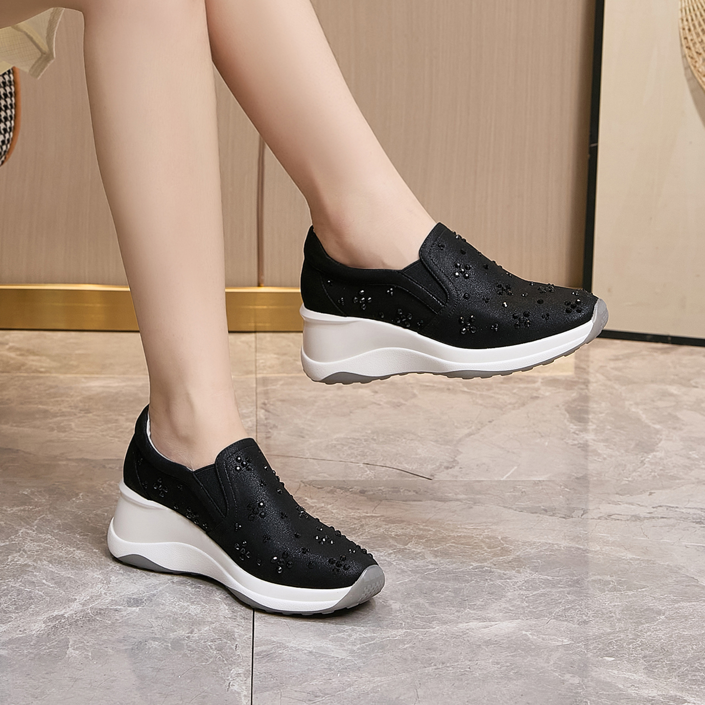 舒服轻便散步鞋 艾淇水钻花朵休闲鞋 一脚蹬坡跟单鞋 新款 女2025秋季