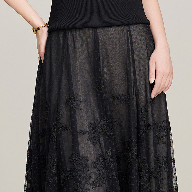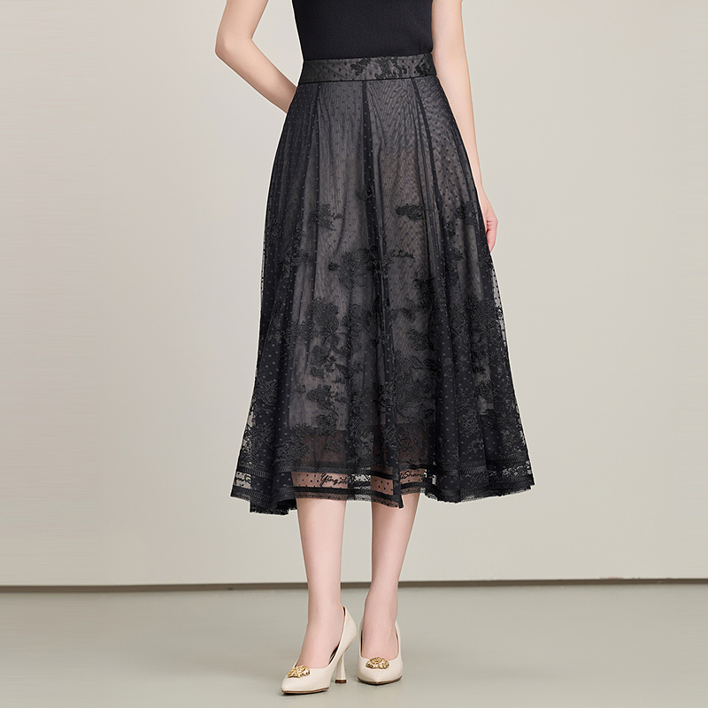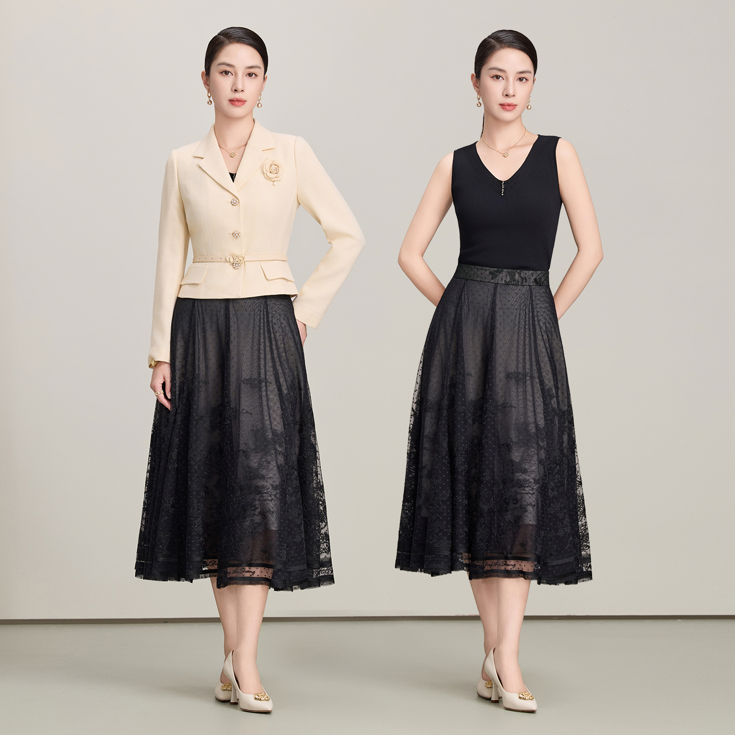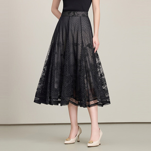 a字高腰垂感秋冬伞裙 中长款 黑色花边毛呢半身裙女秋季 2025年新款