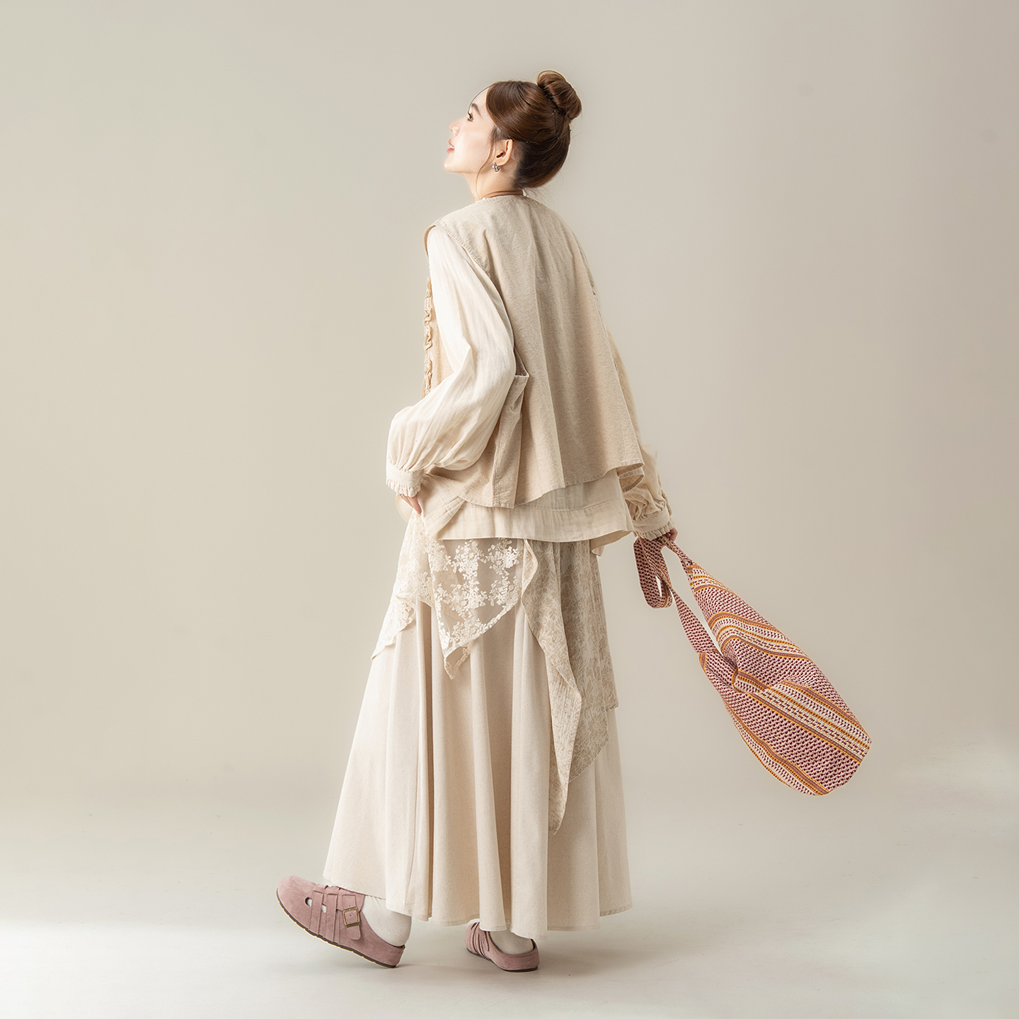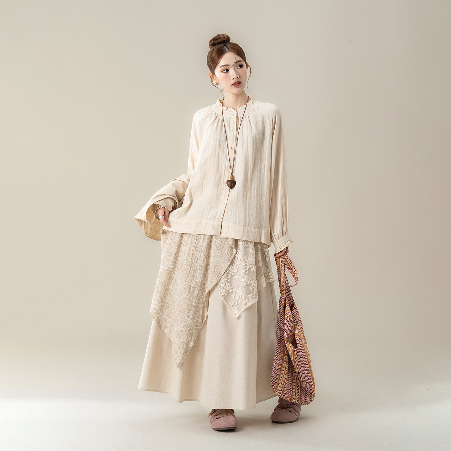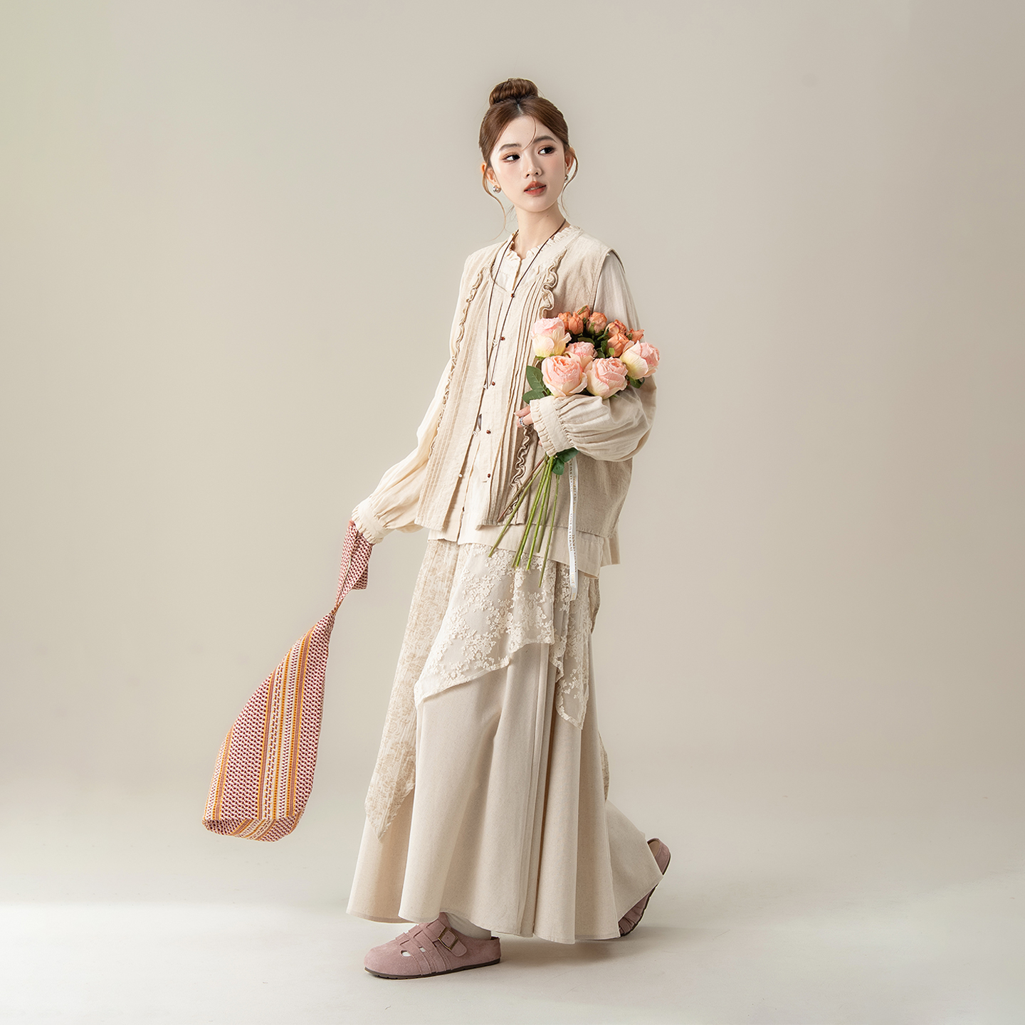 不规则半身裙子套装 叠穿衬衫 新款 麻本杏甜美木耳边马甲背心女秋季