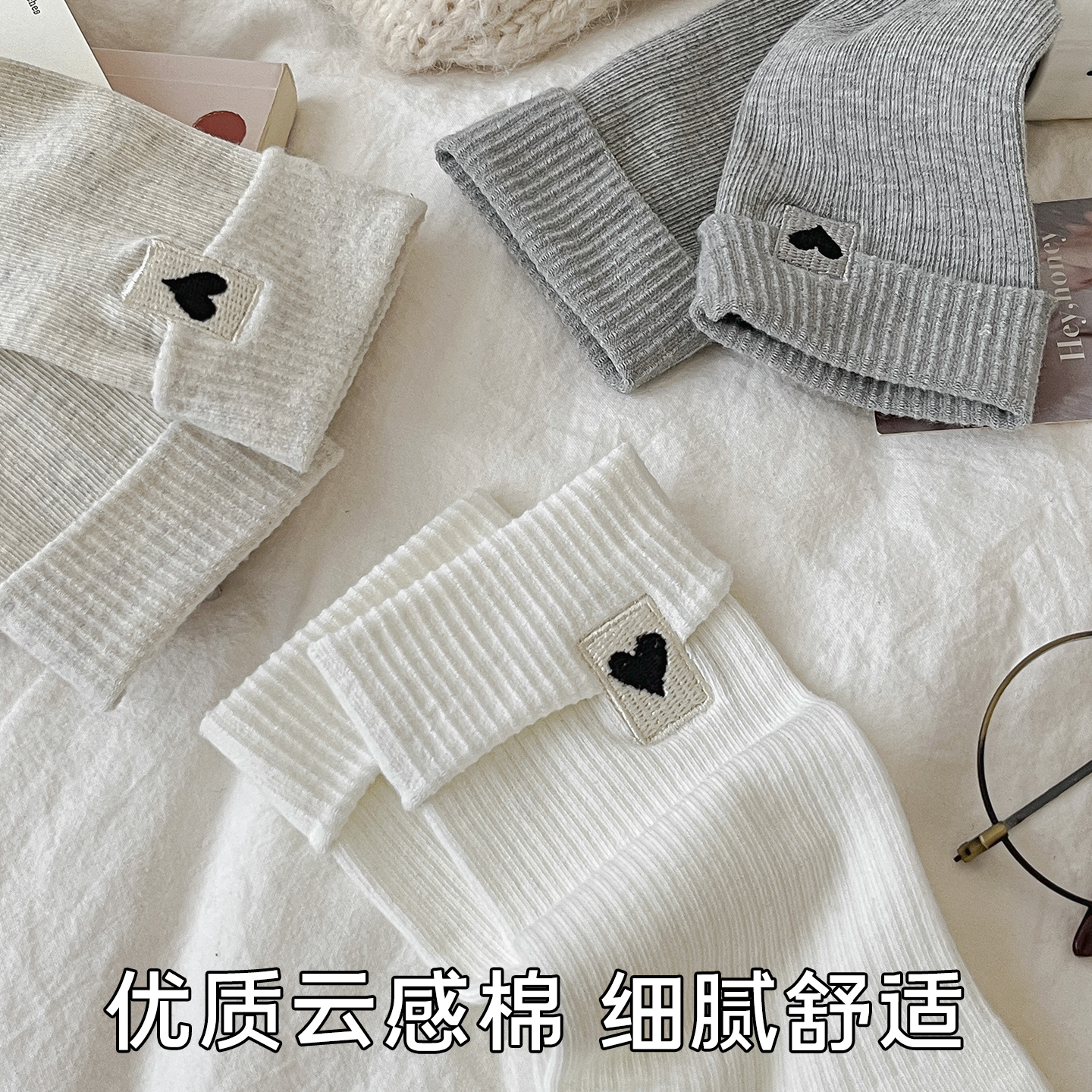 袜子女款 中筒袜春秋纯棉纱线无骨透气翻边爱心刺绣韩系白色堆堆袜