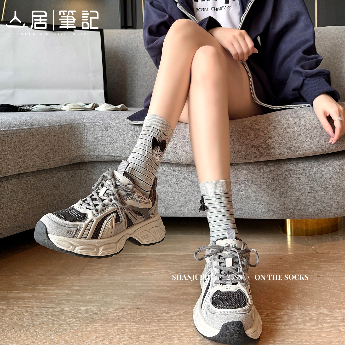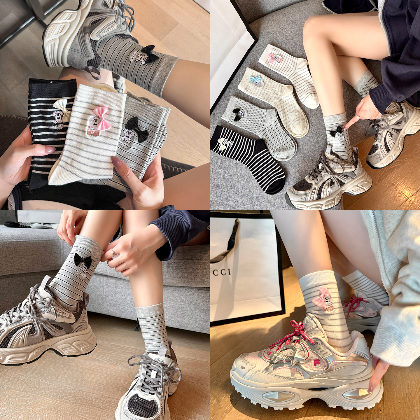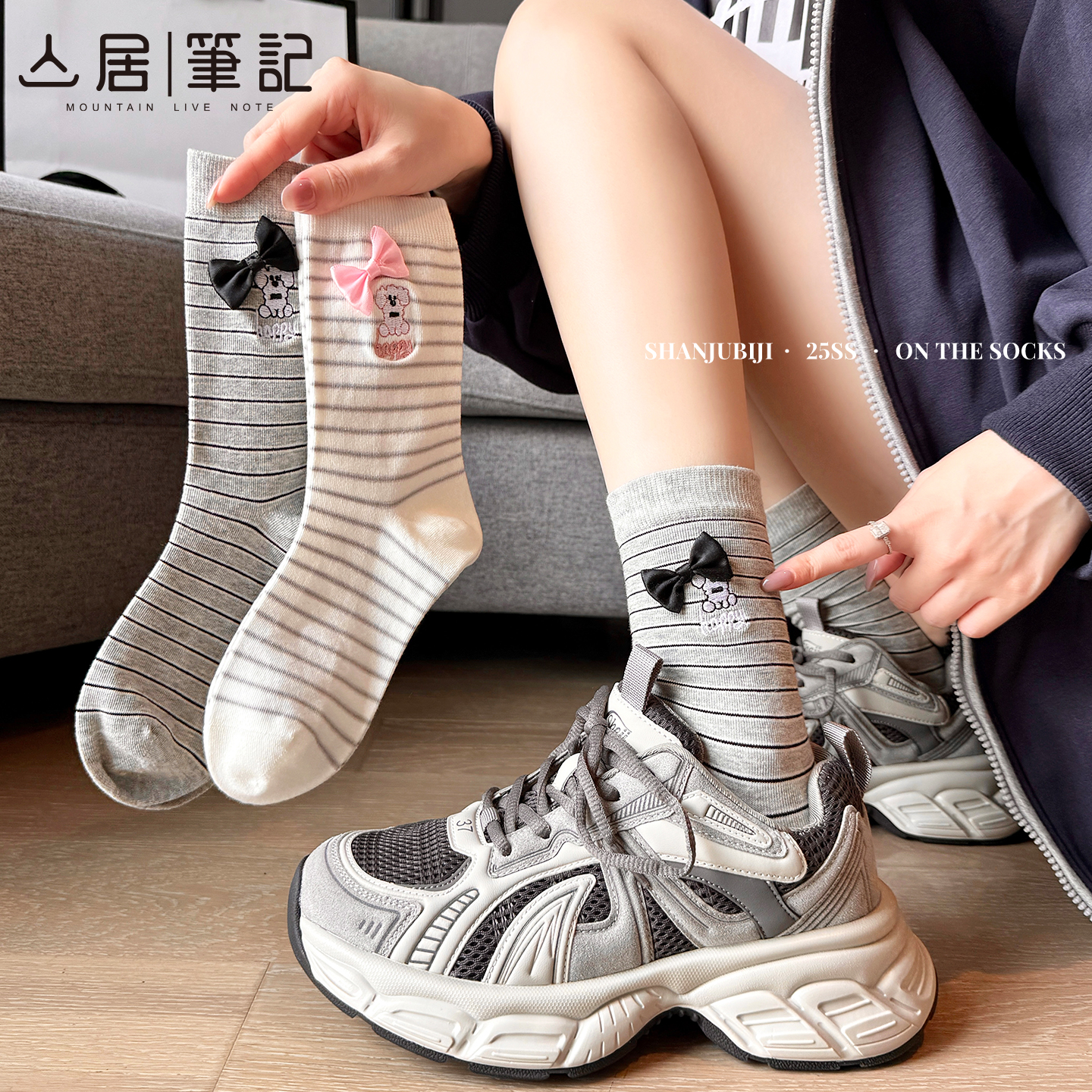 网红超火设计感女款 爆款 蝴蝶结条纹棉袜 中筒袜2025新款 袜子女秋季