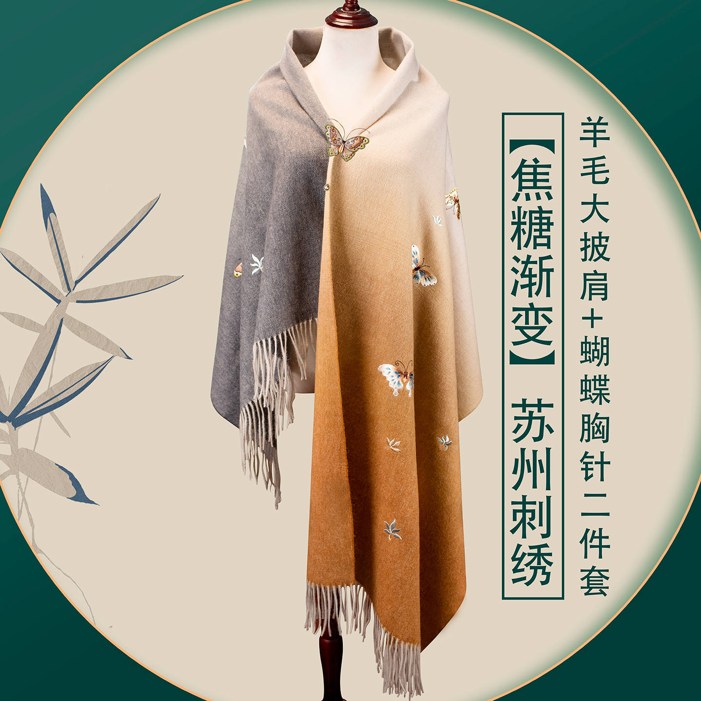 苏绣羊绒围巾秋冬女妈妈生日母亲刺绣胸针套羊毛披肩保暖丝巾礼物