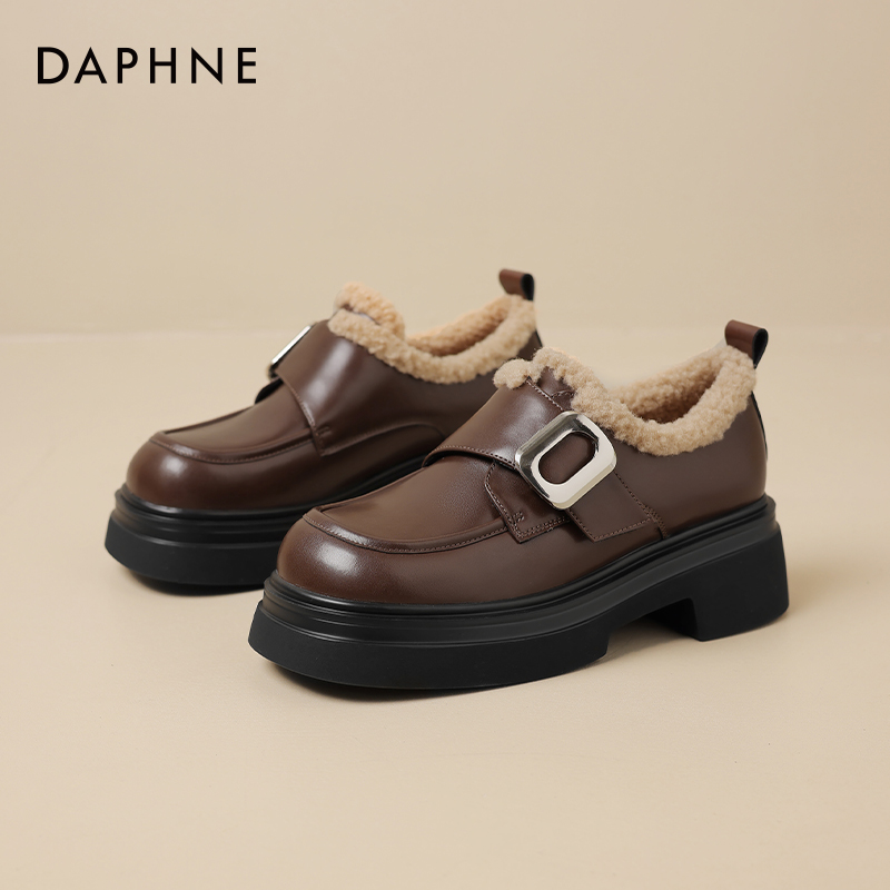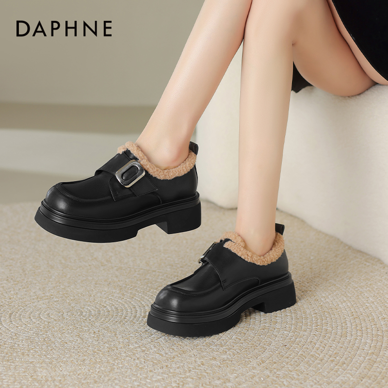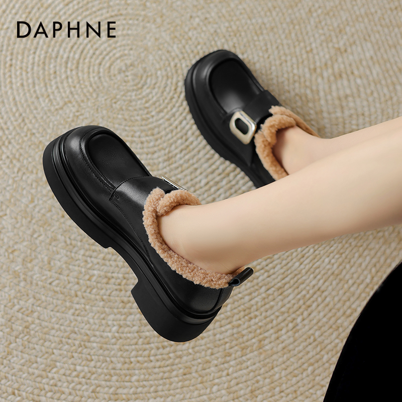单鞋 达芙妮厚底乐福鞋 秋冬加绒毛毛鞋 英伦风黑色小皮鞋 女2025新款
