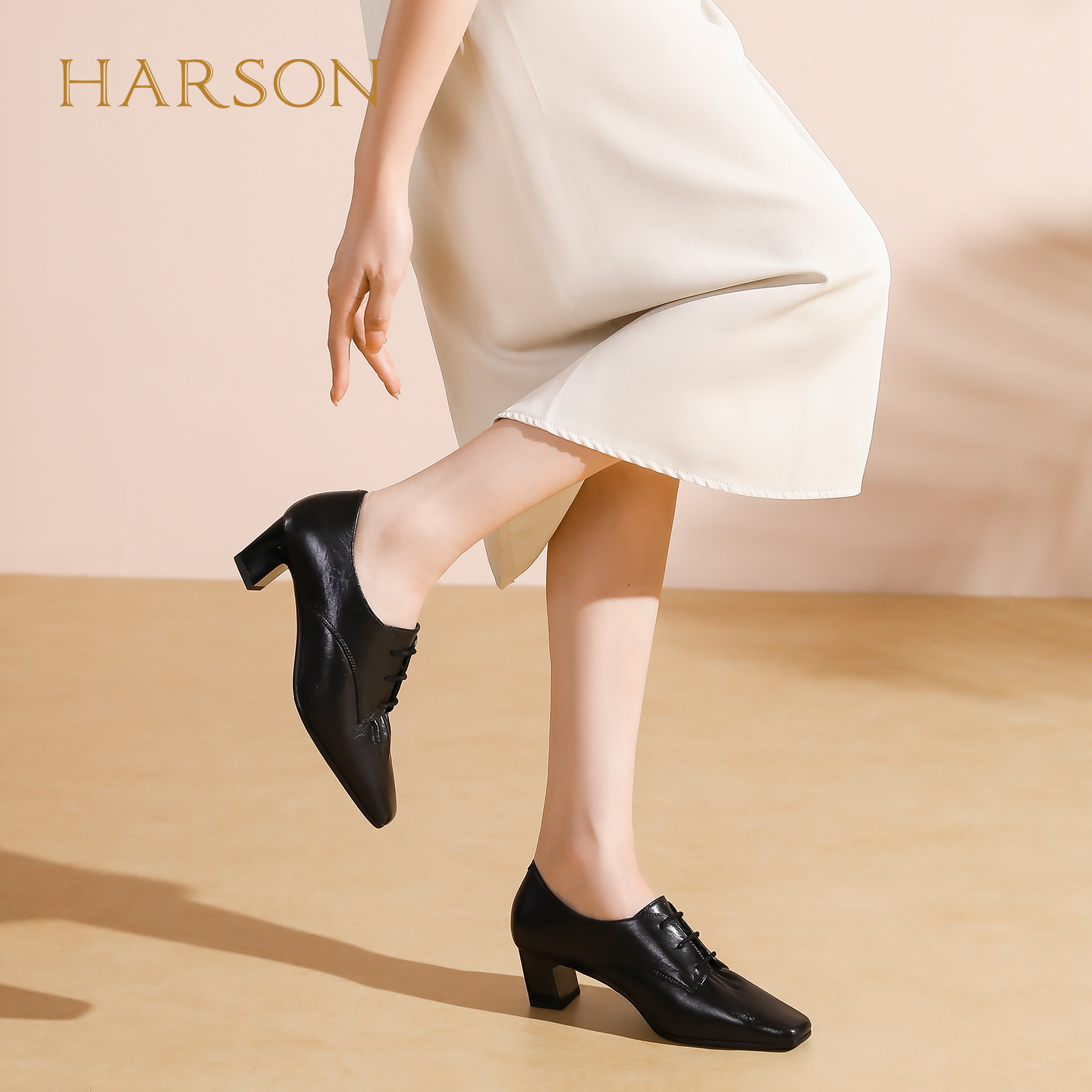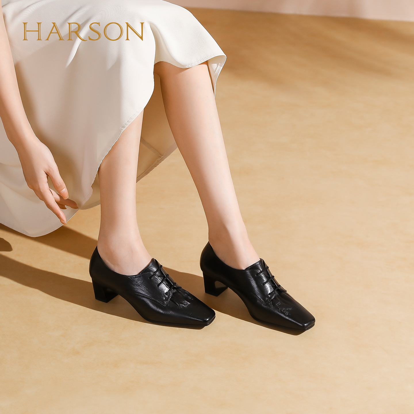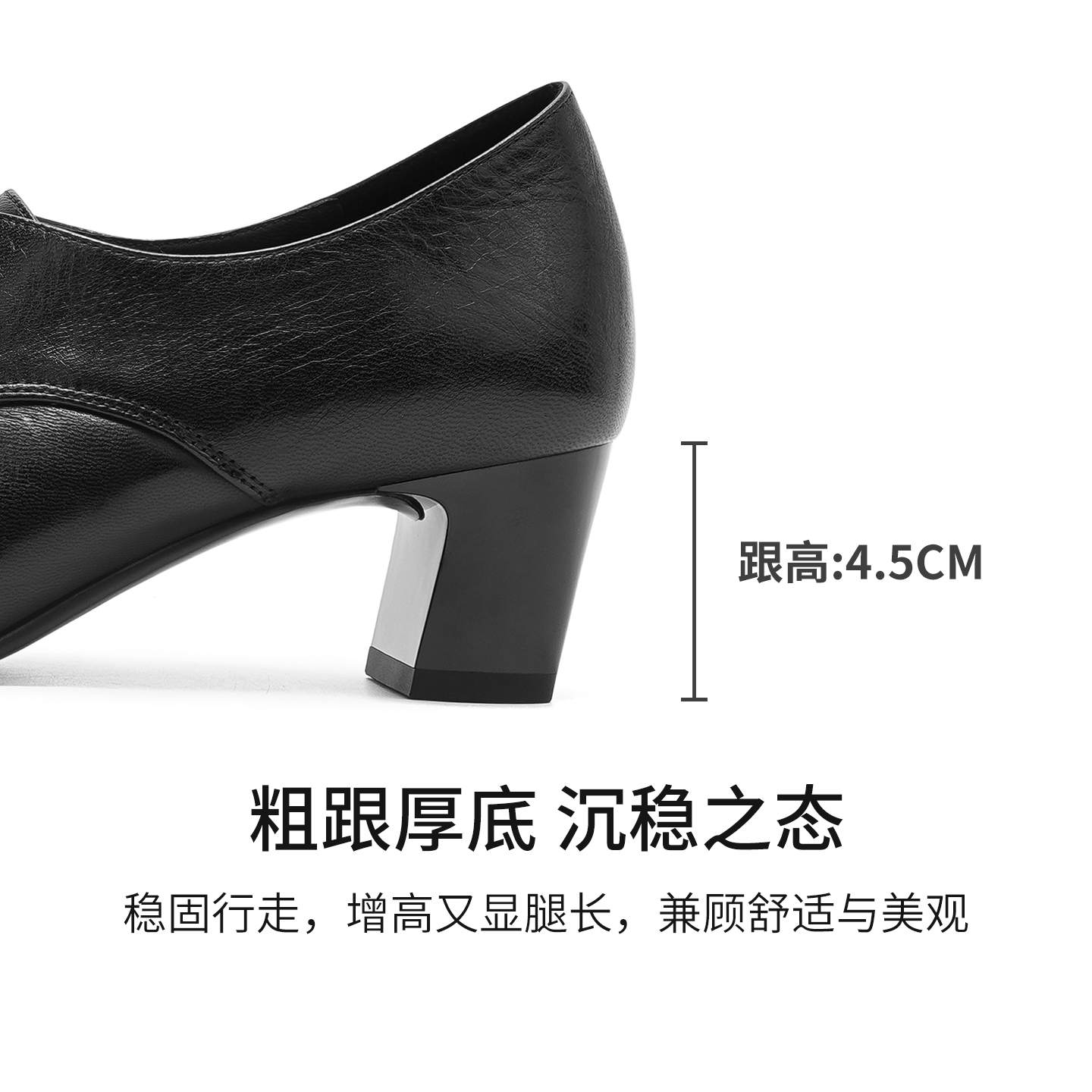 2025秋新款 粗高跟上班通勤女鞋 HWL250172 德比鞋 哈森方头黑色皮鞋