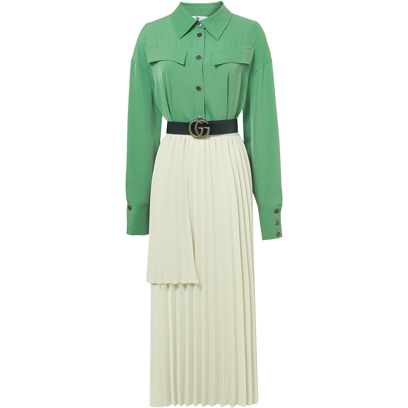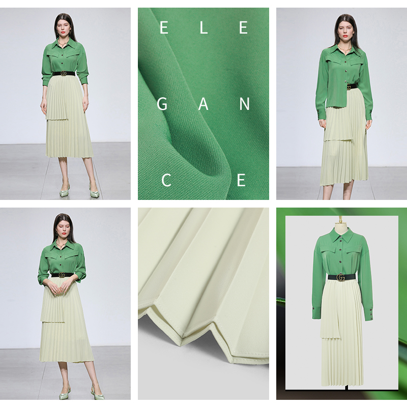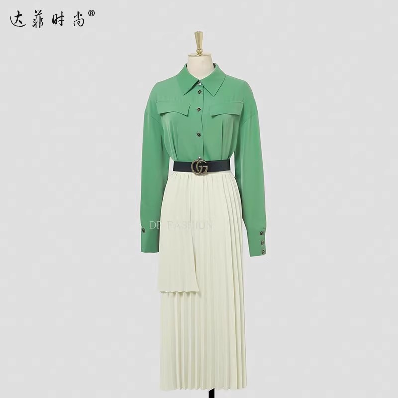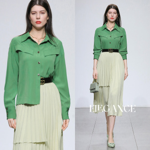 上衣百褶半身裙套装 秋装 气质两件套绿色衬衫 2025新款 潮 女装