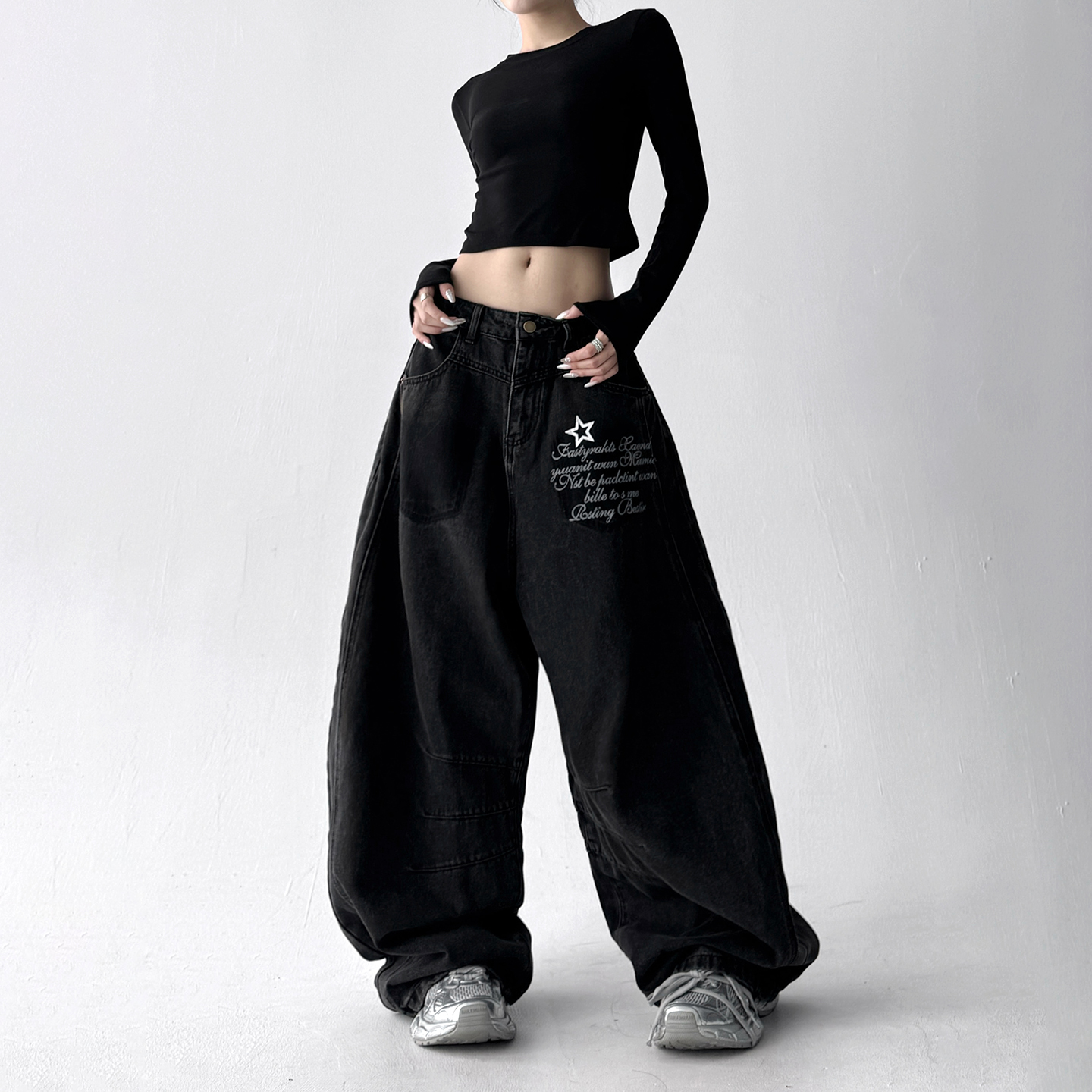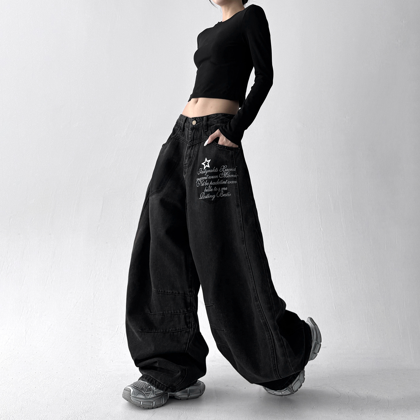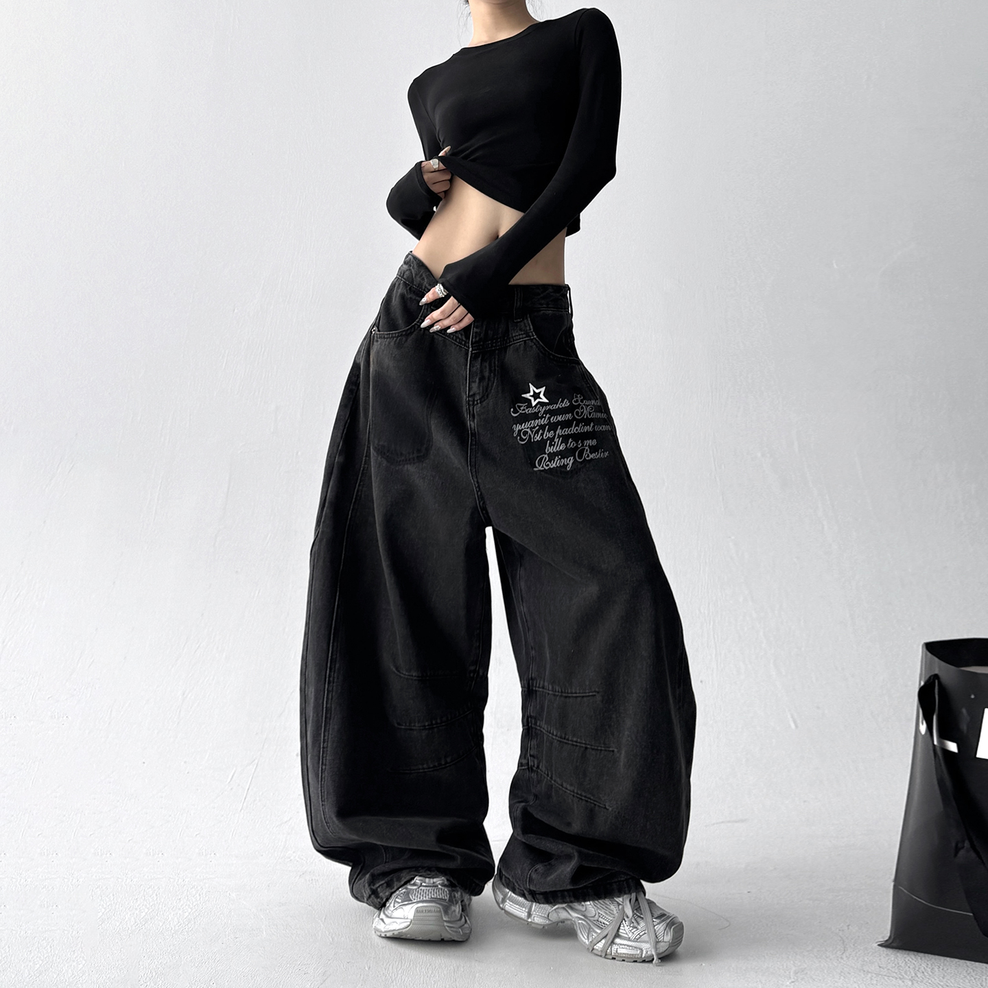 女cleanfit宽松慵懒风休闲阔腿裤 复古水洗弯刀牛仔裤 美式 2025秋季