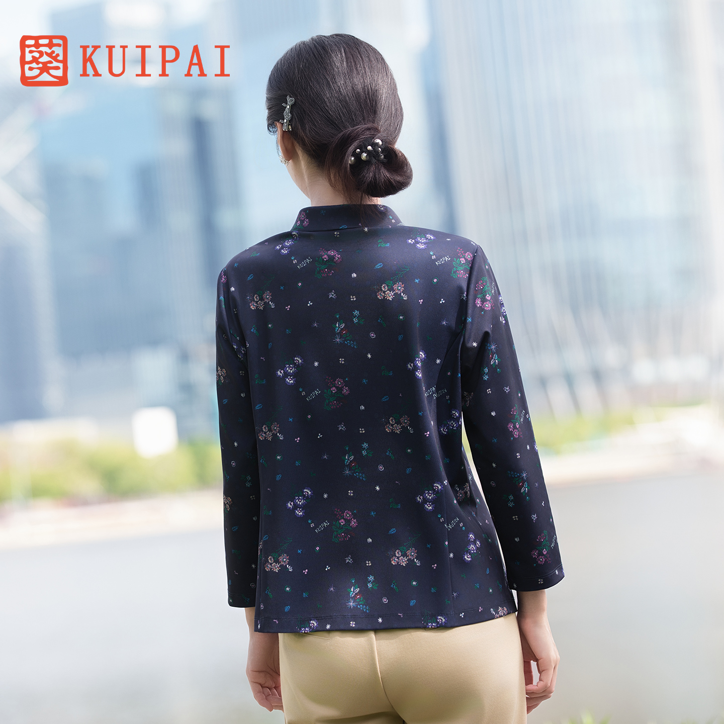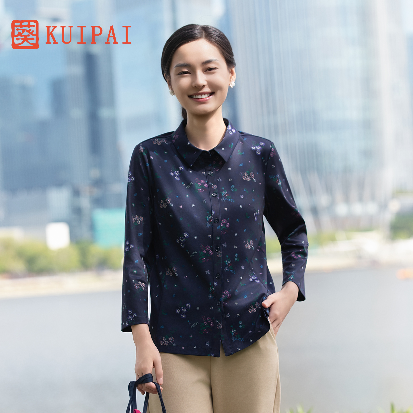 针织翻领微弹印花单排扣衬衫 中年妈妈40岁50岁长袖 新品 葵2025秋季