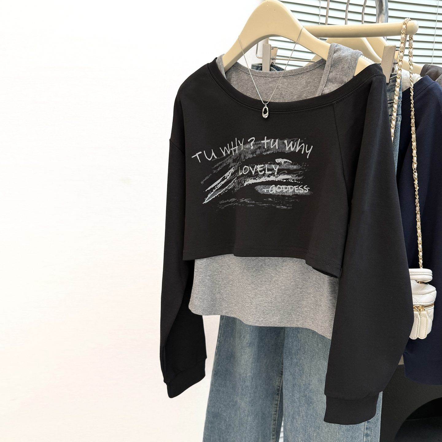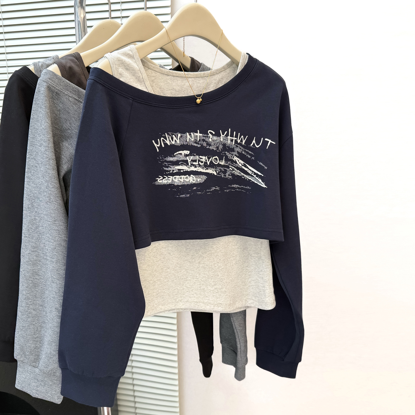 长袖 修身 卫衣女春秋季 韩版 背心两件套上衣潮 2025新款 斜肩露肩短款