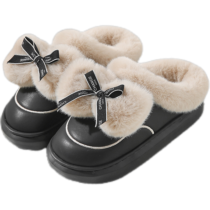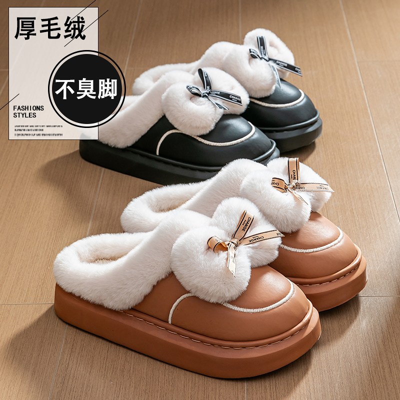 松弛感ins风 居家拖鞋 加厚蝴蝶结防水皮拖棉拖鞋 女士可爱毛毛拖鞋