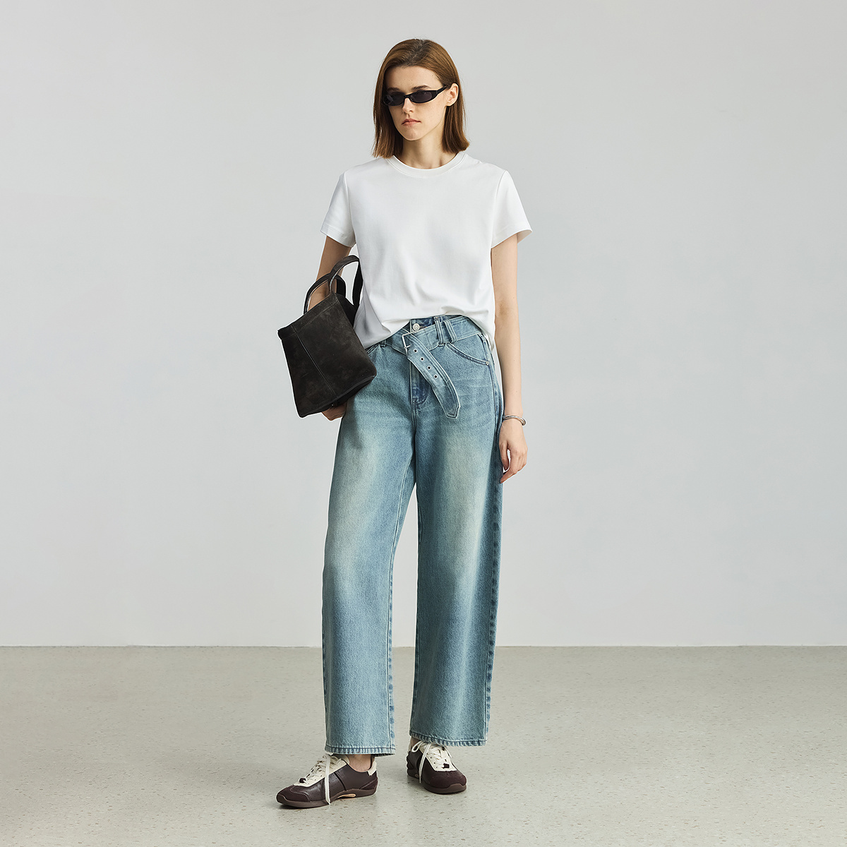 325249013 女2025夏老钱风含棉撞色腰带设计九分裤 Vero Moda牛仔裤