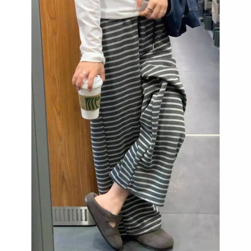 大码 日系慵懒条纹休闲阔腿裤 设计感宽松高腰直筒裤 新款 女2025秋季