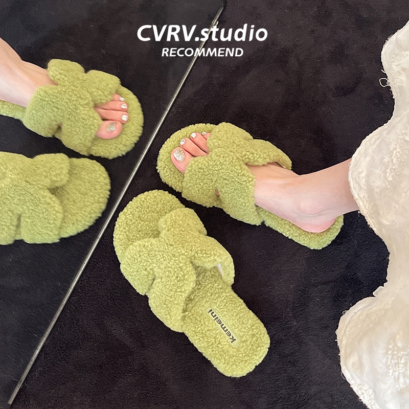 网红毛绒平底一字棉拖鞋 软底舒适一脚蹬毛毛拖 女外穿2025秋冬新款