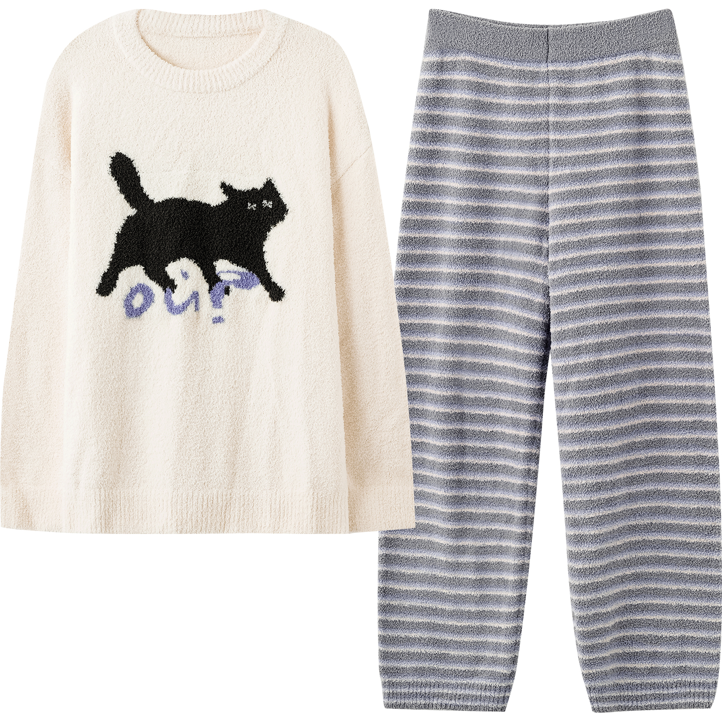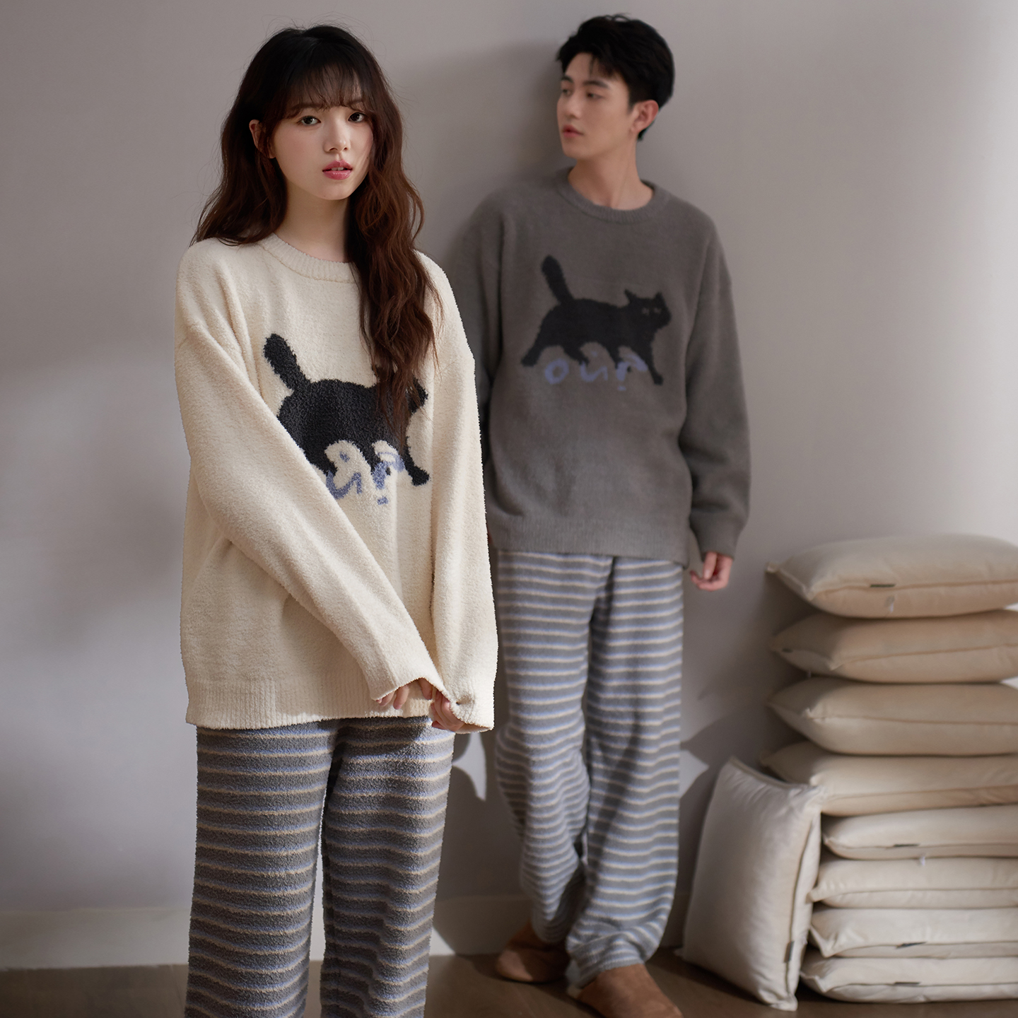 马克公主可爱猫咪情侣睡衣女秋冬款 可外穿家居服男 半边绒条纹长裤