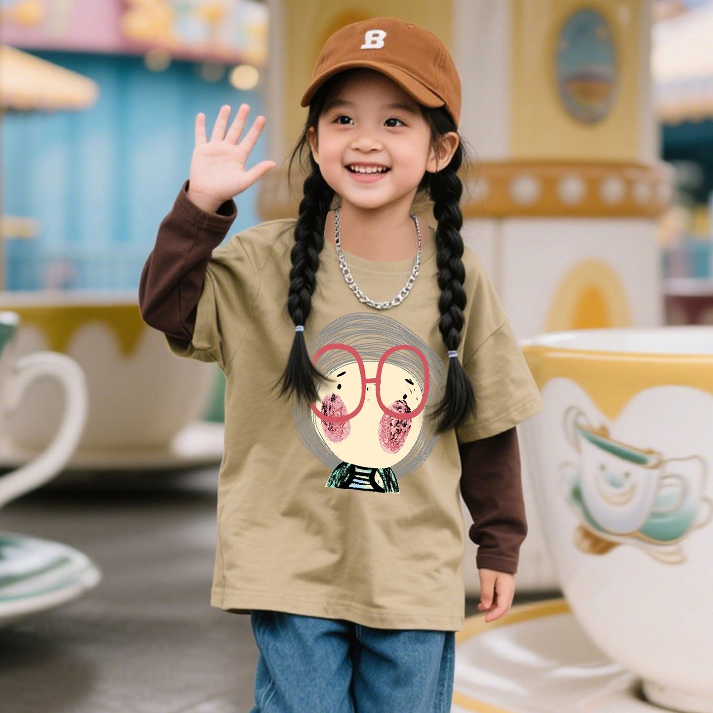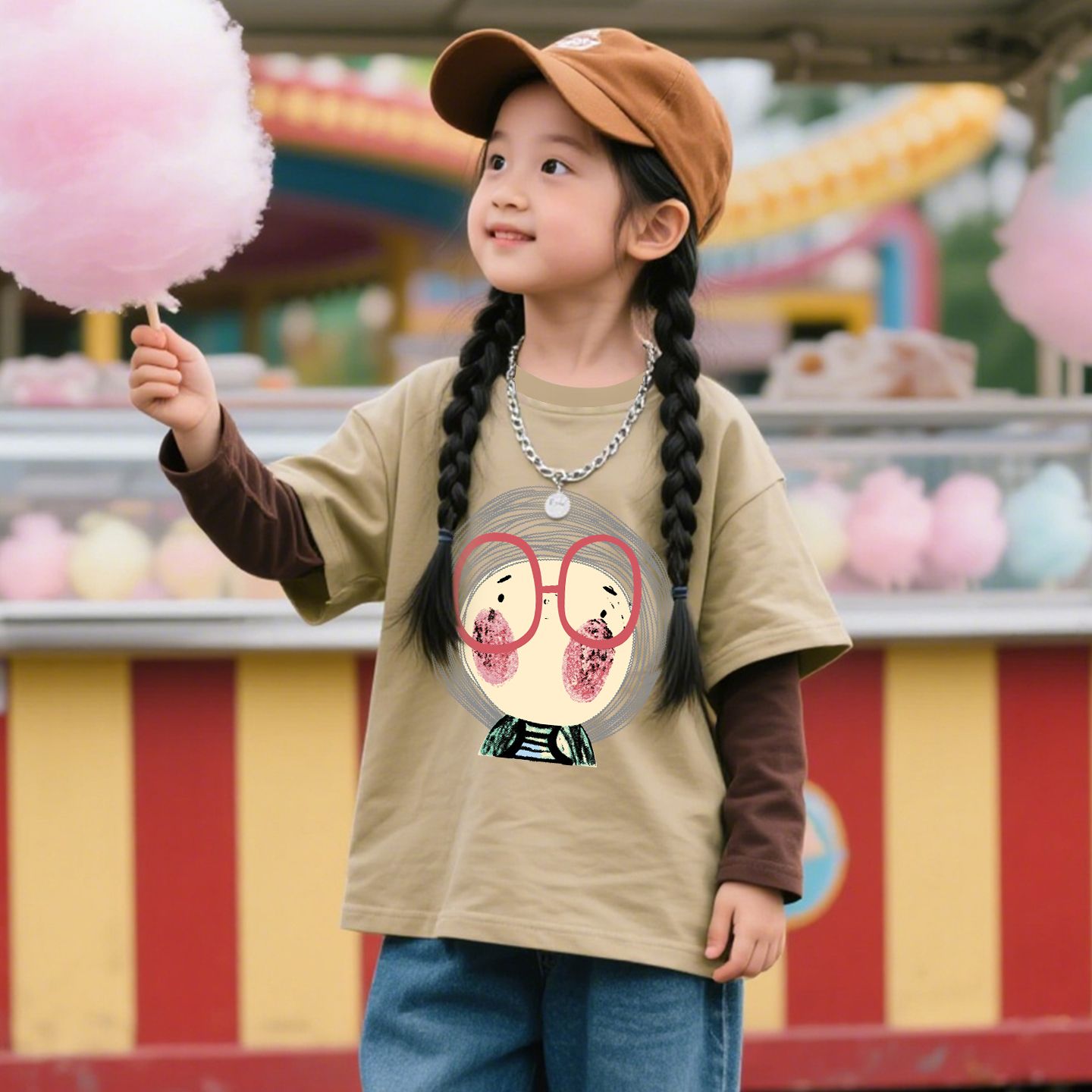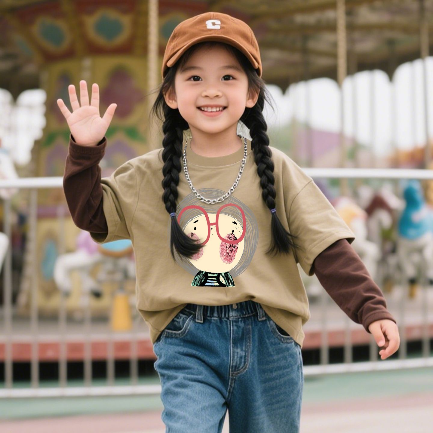 上衣 中大童假两件拼接长袖 洋气卡通女童春秋韩版 圆领T恤2025新款