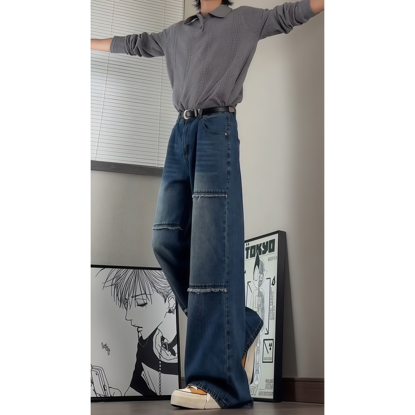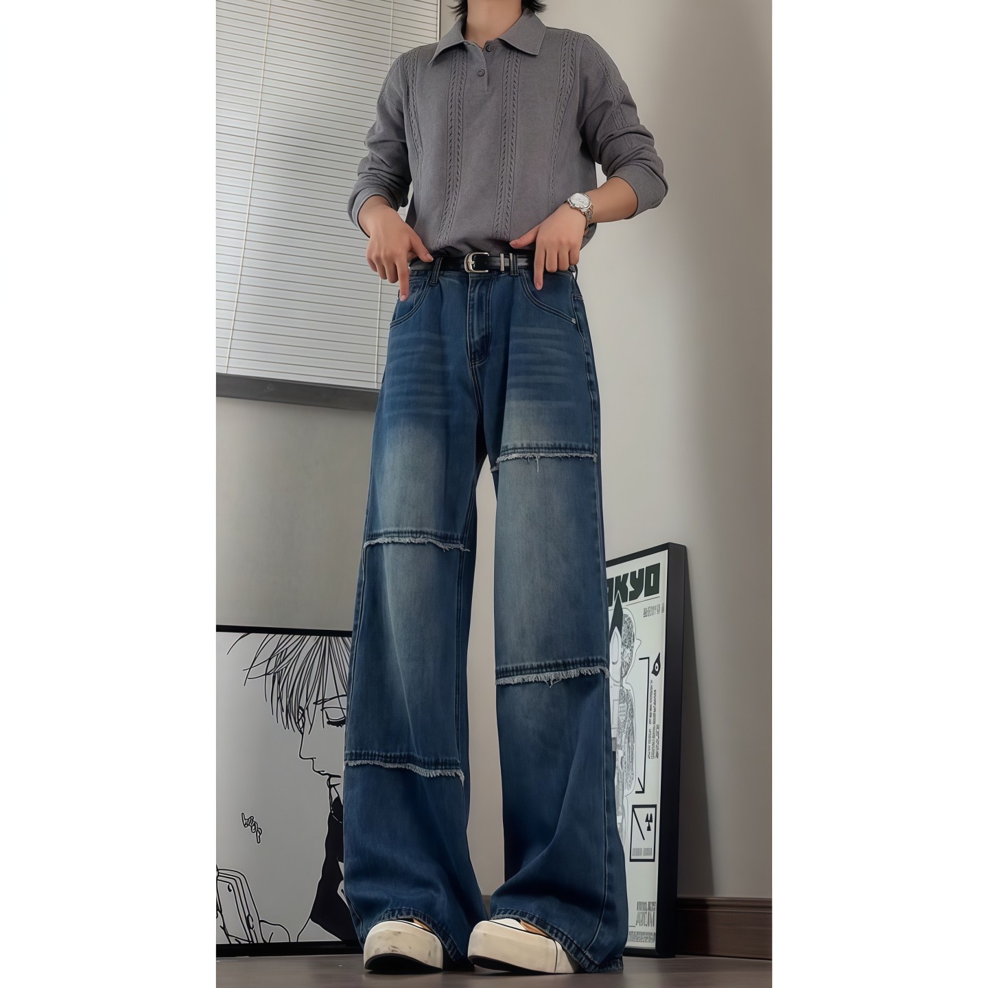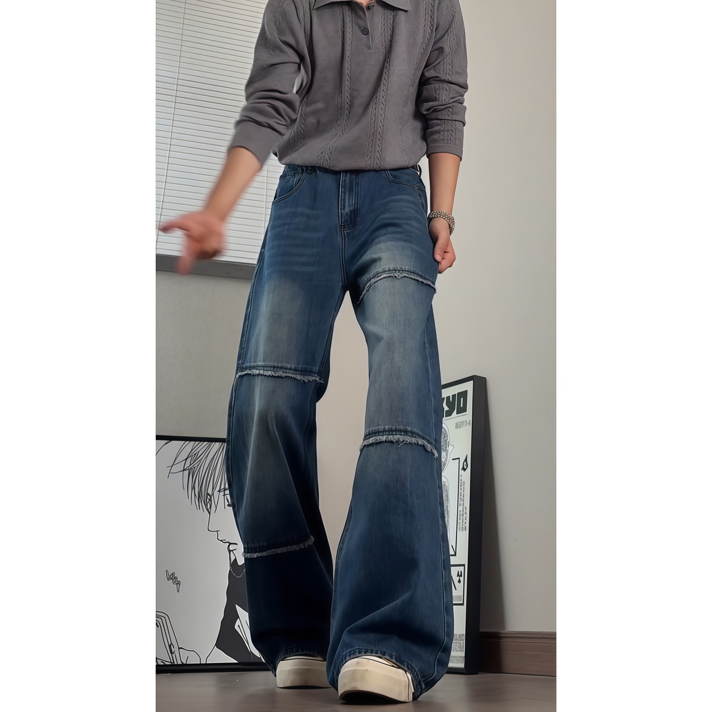 子高腰直筒宽松阔腿裤 高街vibe微喇裤 男美式 小众设计感毛边牛仔裤