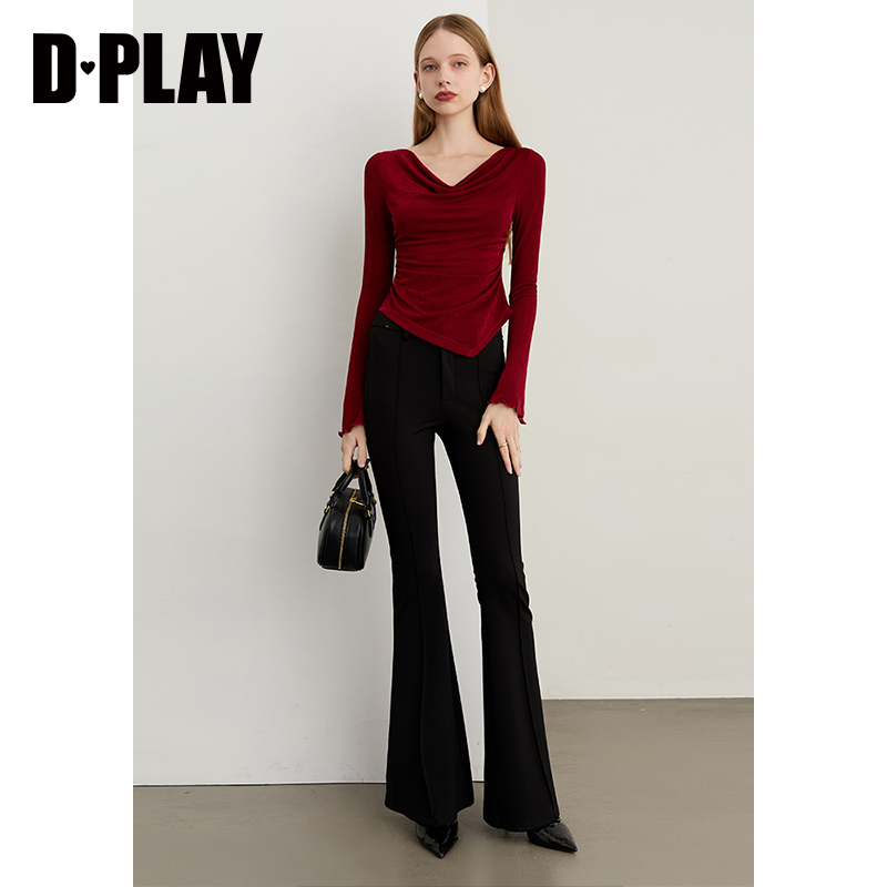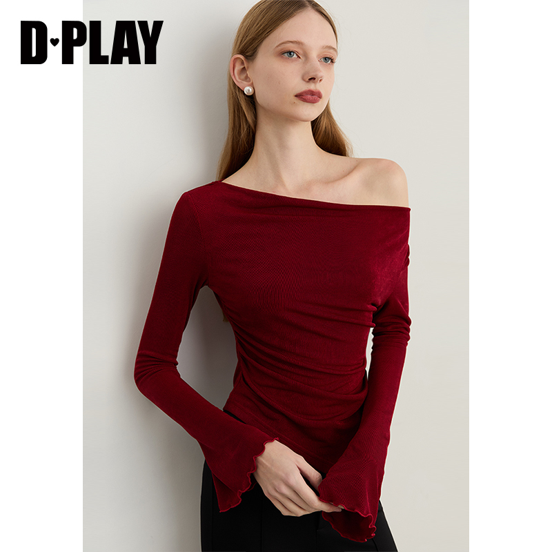 上衣荡领打底衫 DPLAY2025年秋季 修身 红色t恤女时髦气质长袖 新款