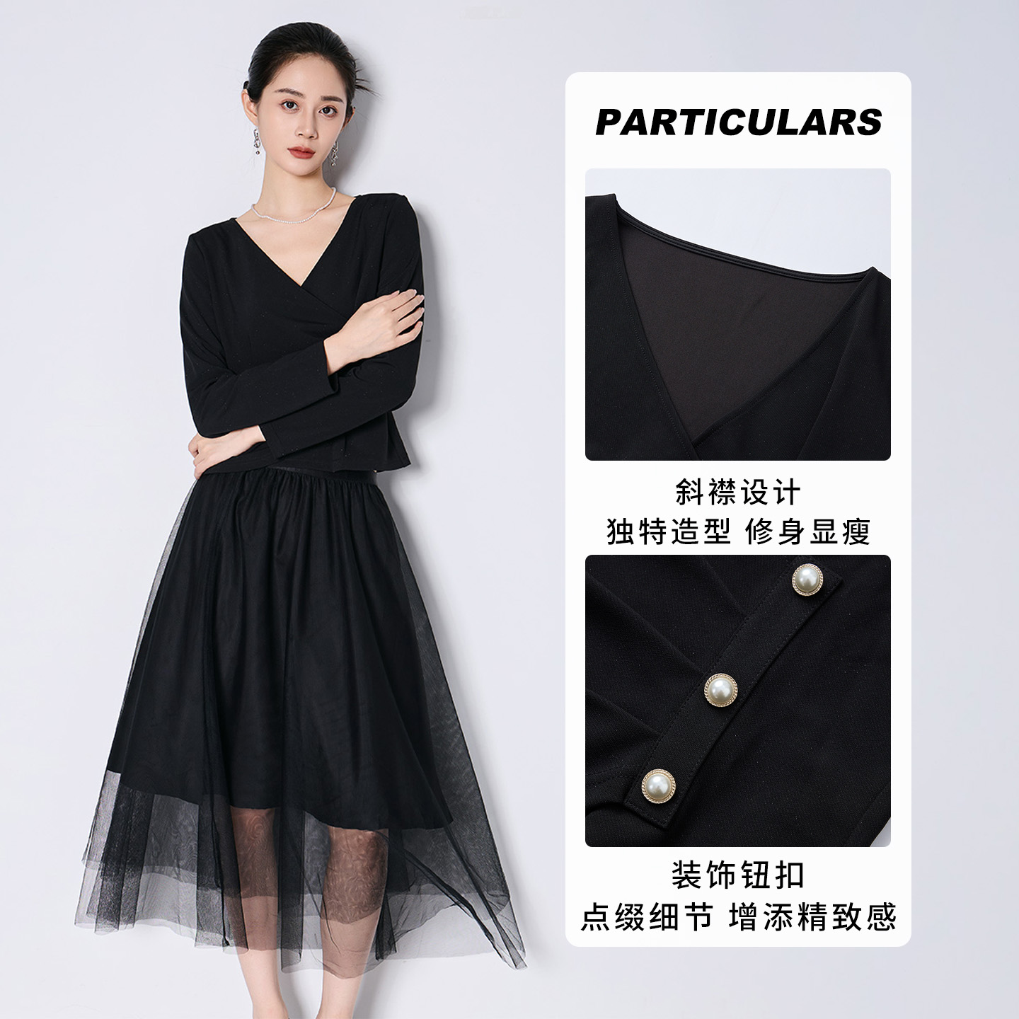 女 上衣网纱半身裙半裙子两件套装 马天奴2025秋冬新款 黑色V领修身