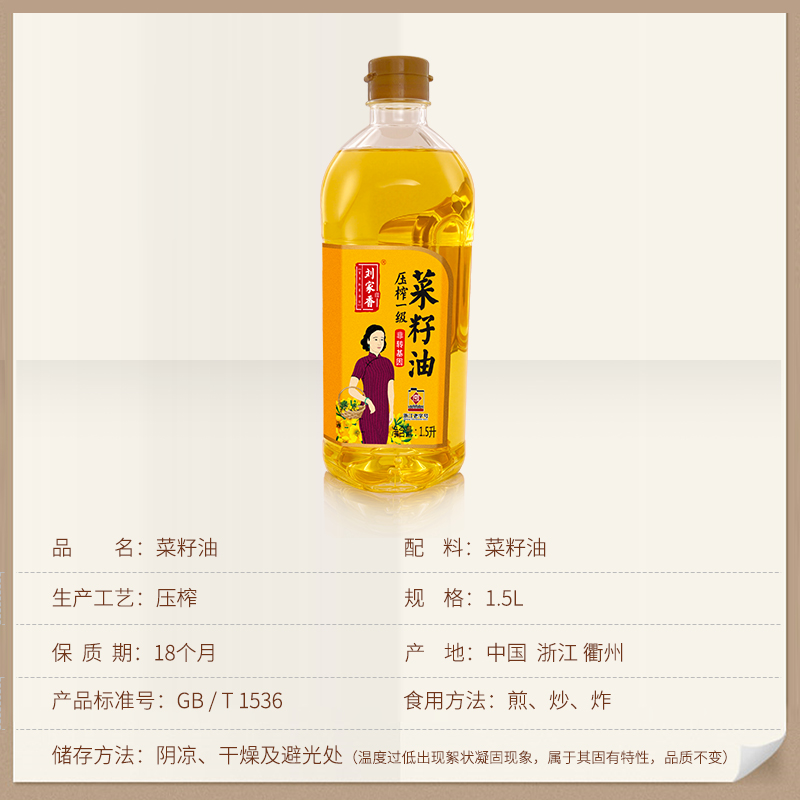 刘家香老字号压榨一级菜籽油1.5L物理压榨食用油小瓶装 便携家用