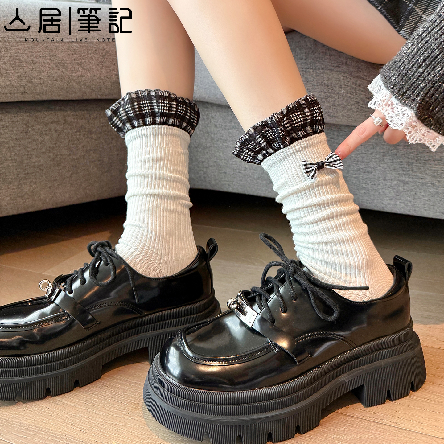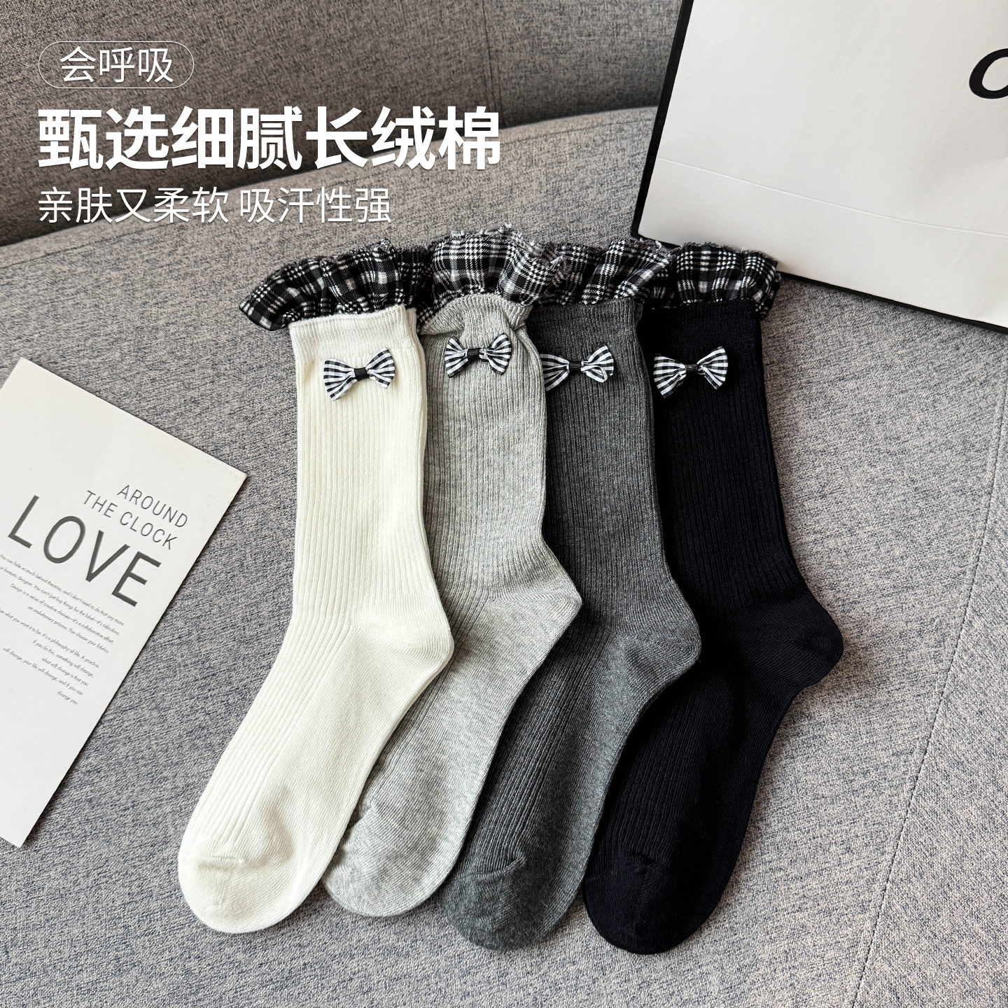 JK搭配小皮鞋 袜子女秋季 超火花边蝴蝶结女款 爆款 中筒棉袜2025新款