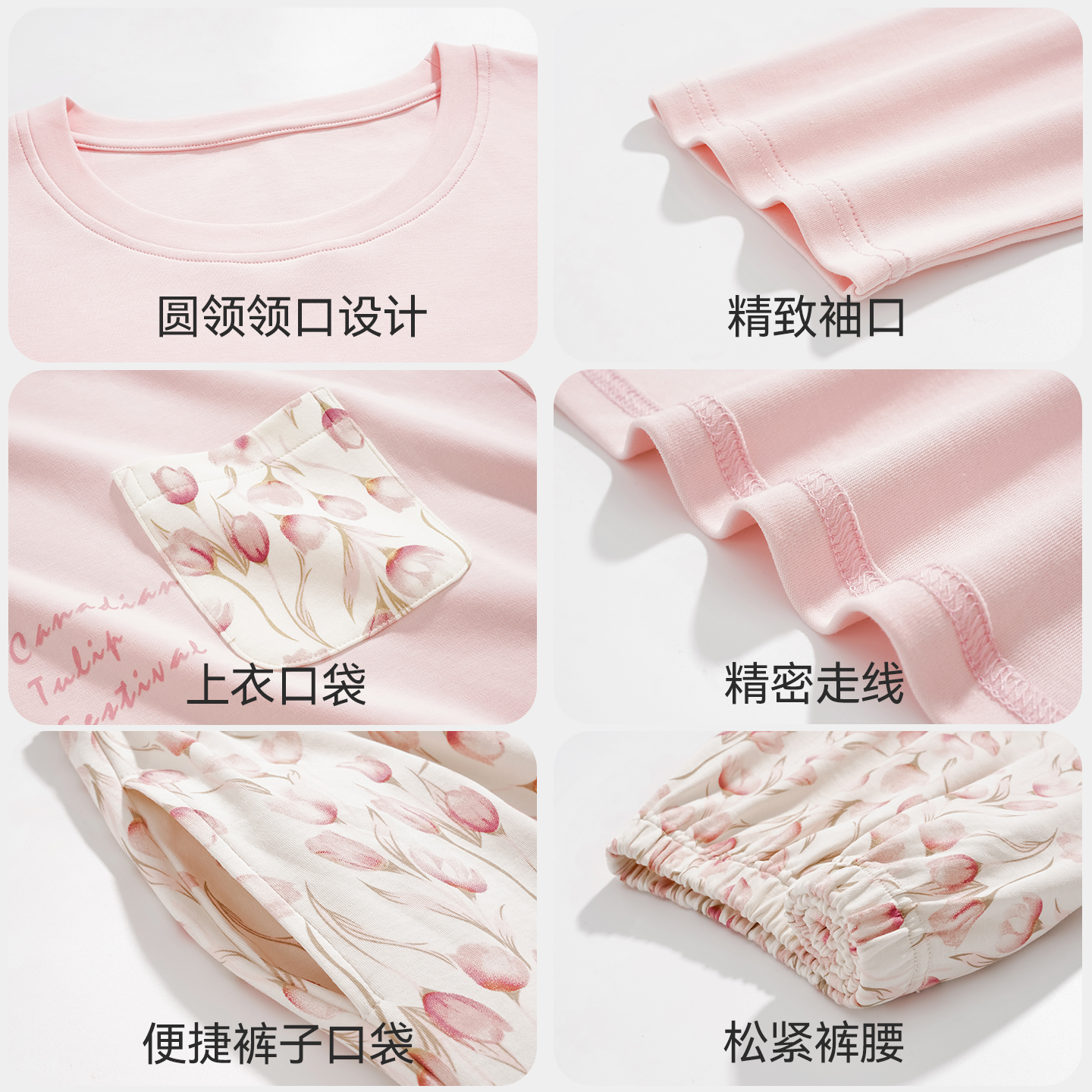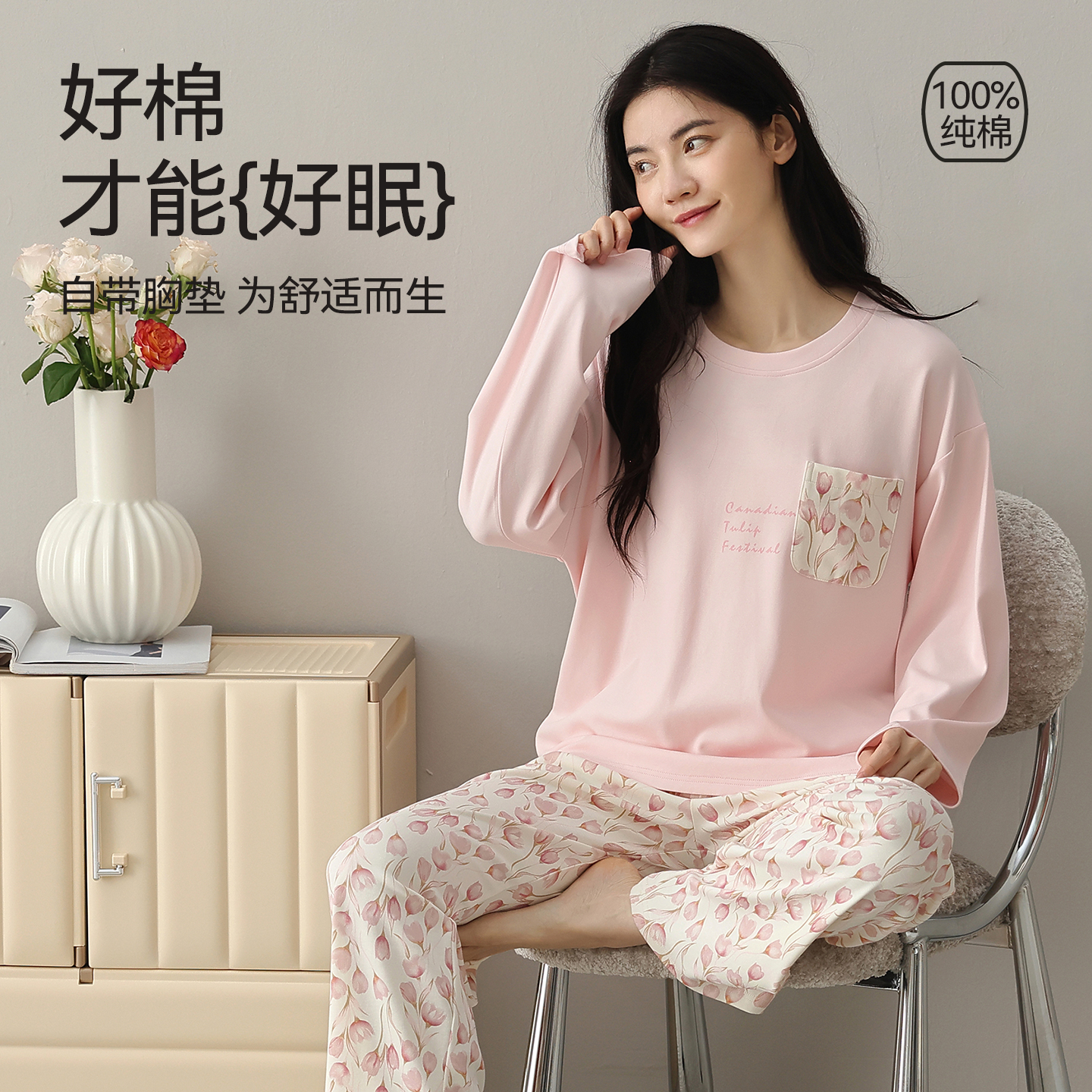 秋季 可外穿家居服套装 款 长袖 樱花粉长裤 婷美纯棉睡衣女2025新款