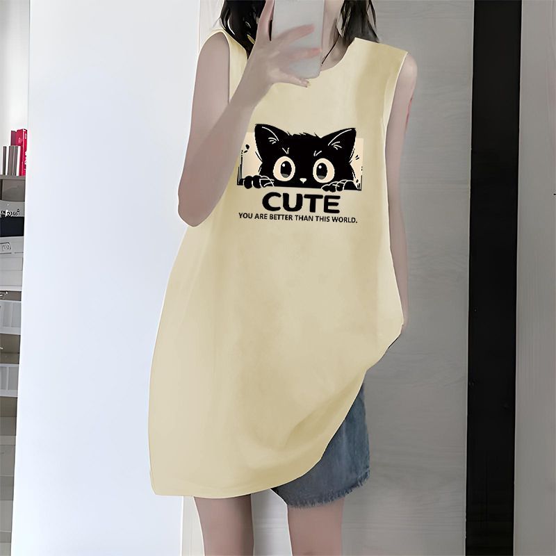 甜辣无袖 美式 中长款 宽松夏季 上衣 杏色背心t恤女装 网红辣妹风新款
