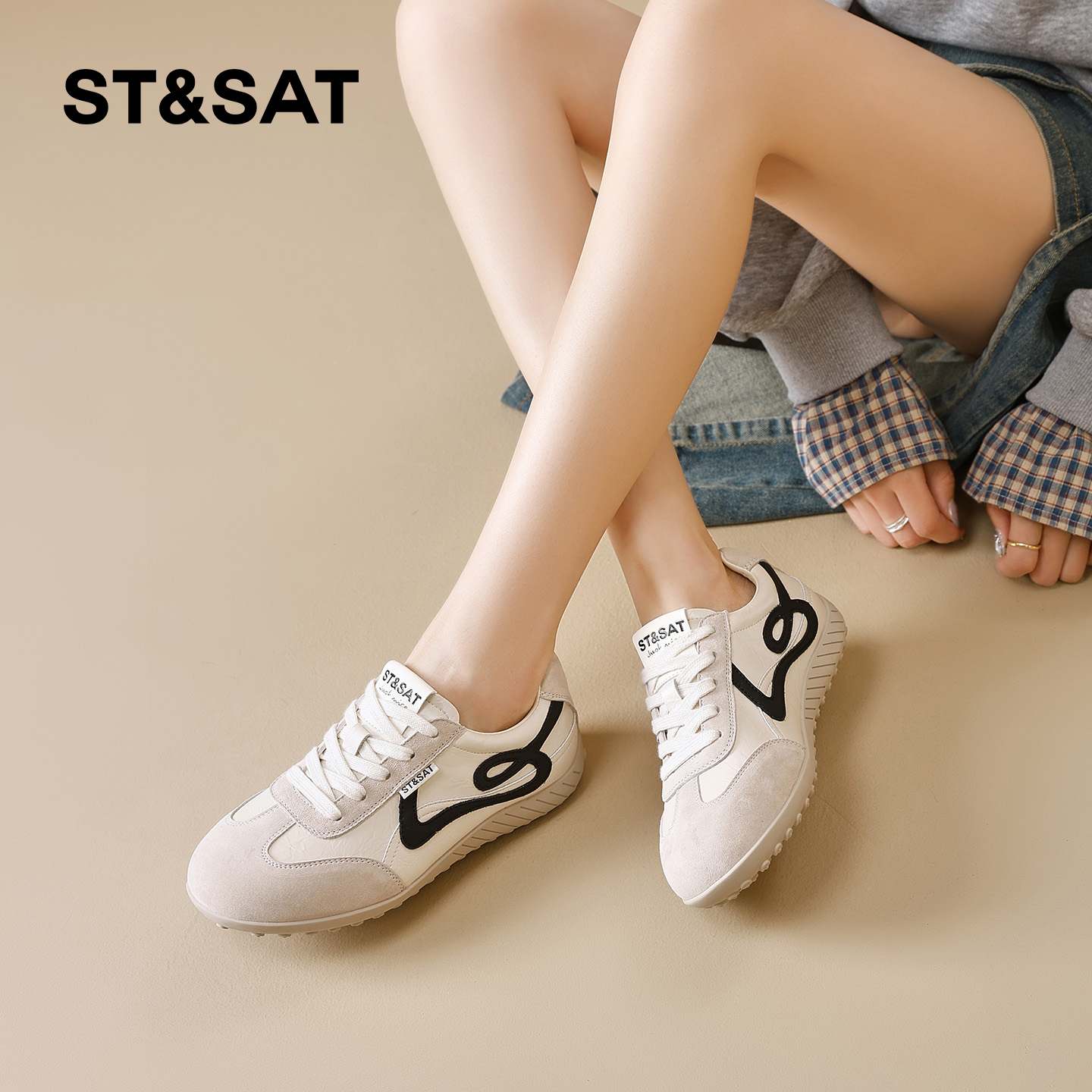 红色运动休闲阿甘鞋 德训鞋 百思图小彩糖25秋新款 女 张予曦同款