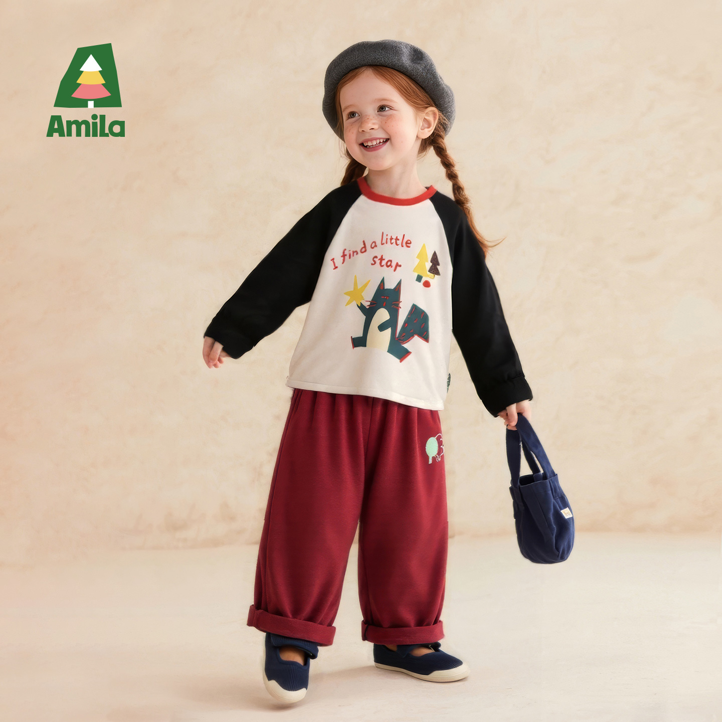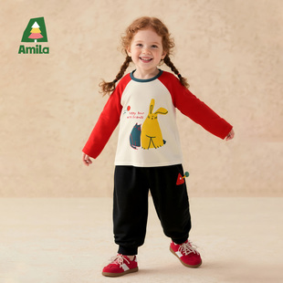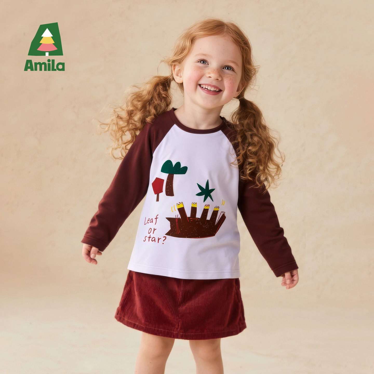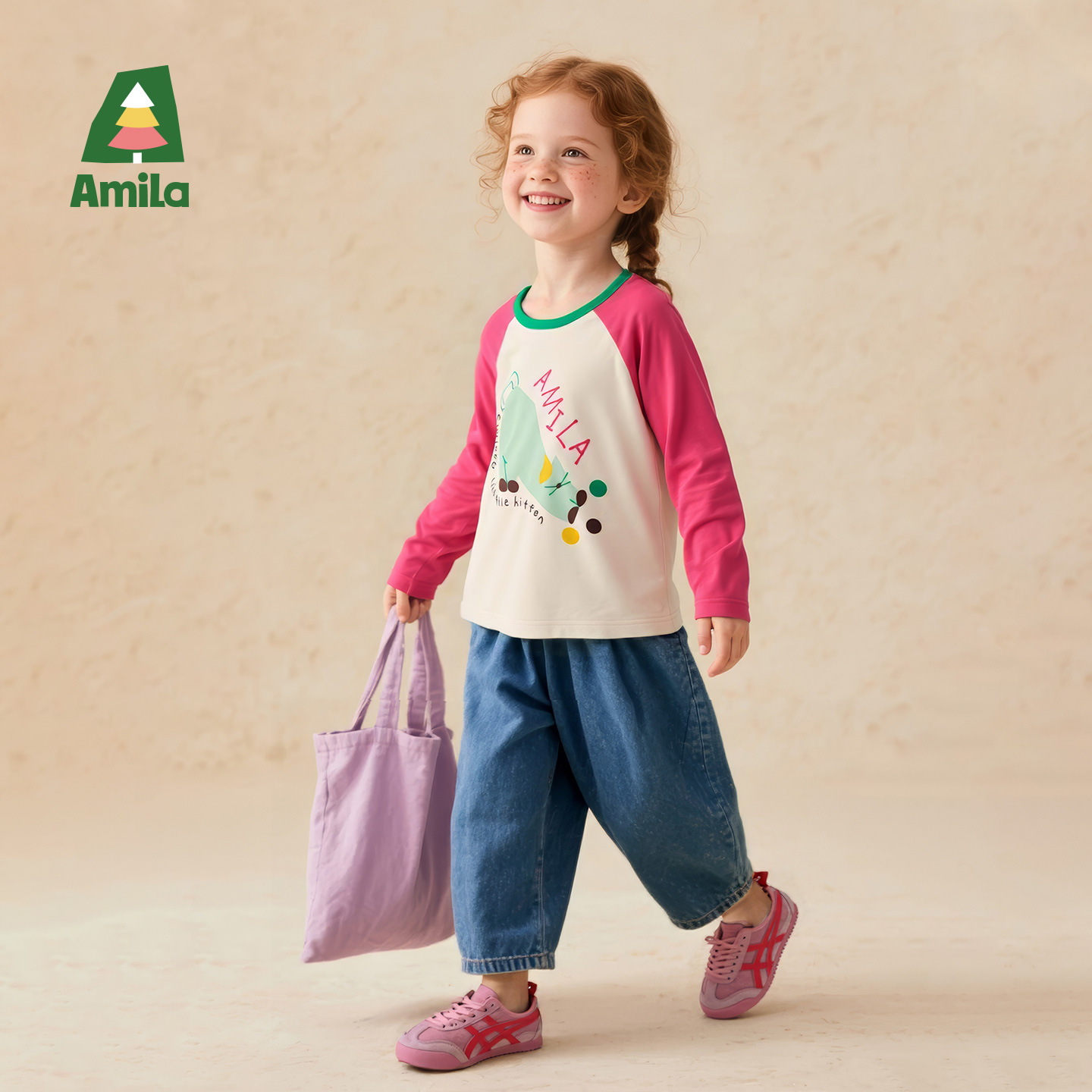 休闲上衣复古百搭2025 宝宝插肩袖 Amila女童长袖 T恤儿童春秋打底衫