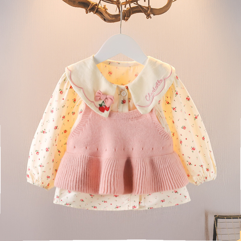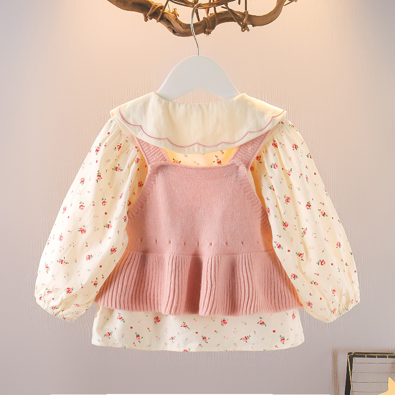 套装 叠穿内搭T恤木耳边牛仔阔腿裤 新款 蓝色镂空针织背心裙女秋季