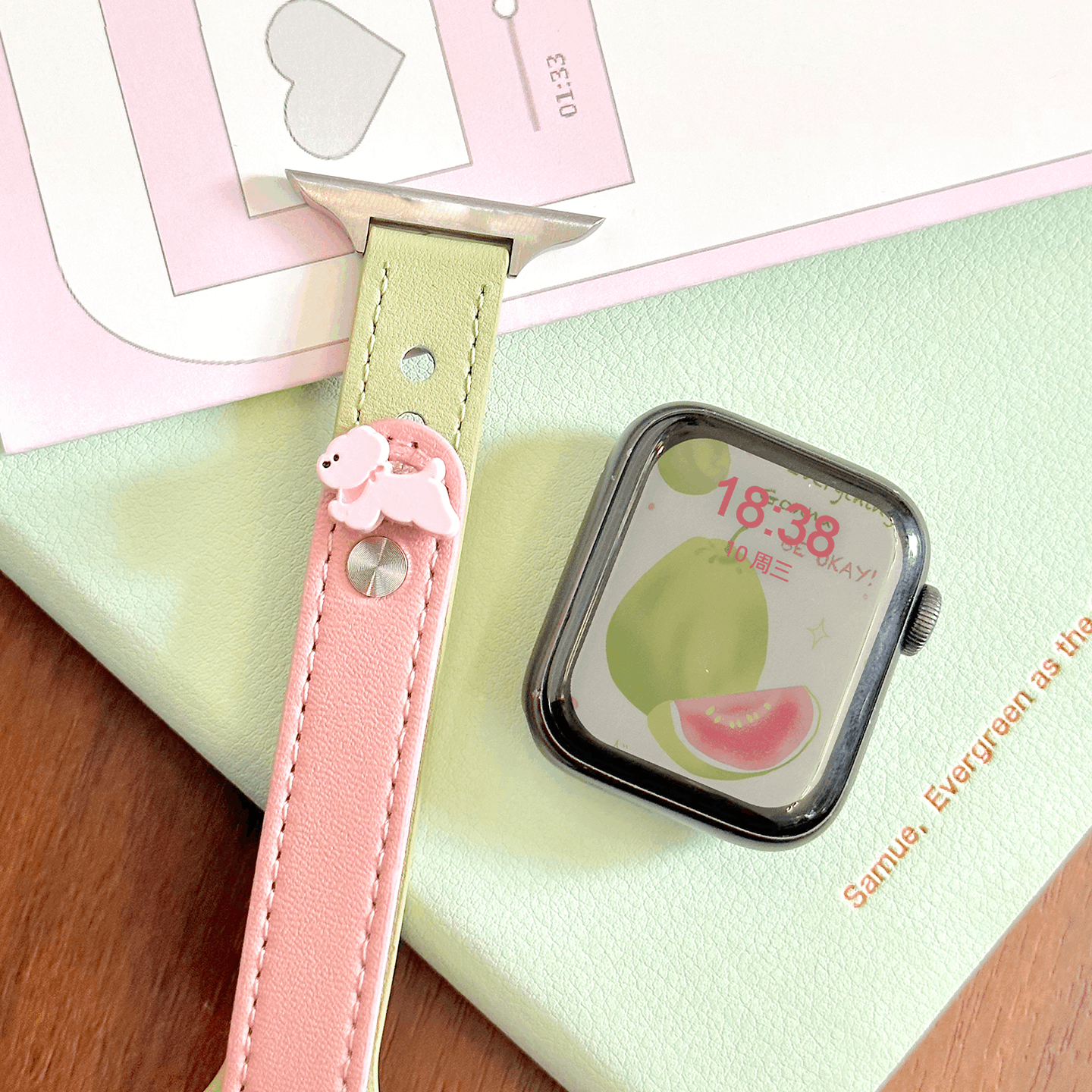 iwatchs9创意8手表表带SE拼色Ultra2夏季 适用于applewatchs10苹果新款 立体粉小狗双钉扣真皮质女 头层牛皮