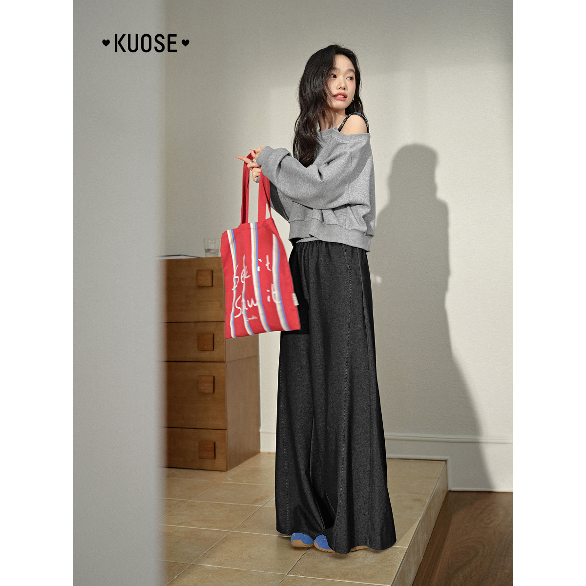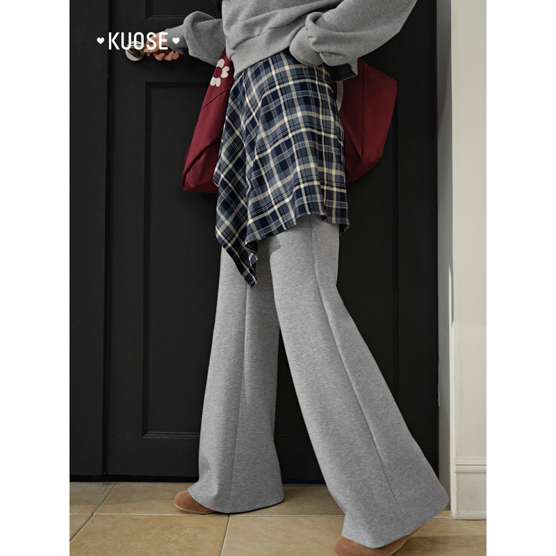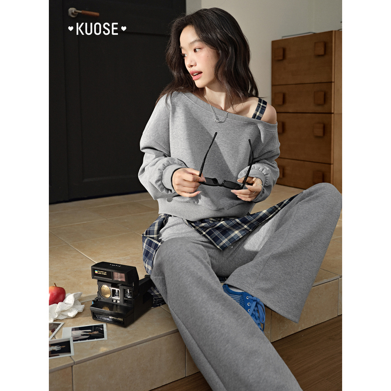 女上衣长裤 阔色灰色斜肩卫衣格子拼接休闲裤 新款 25秋季 子两件套装