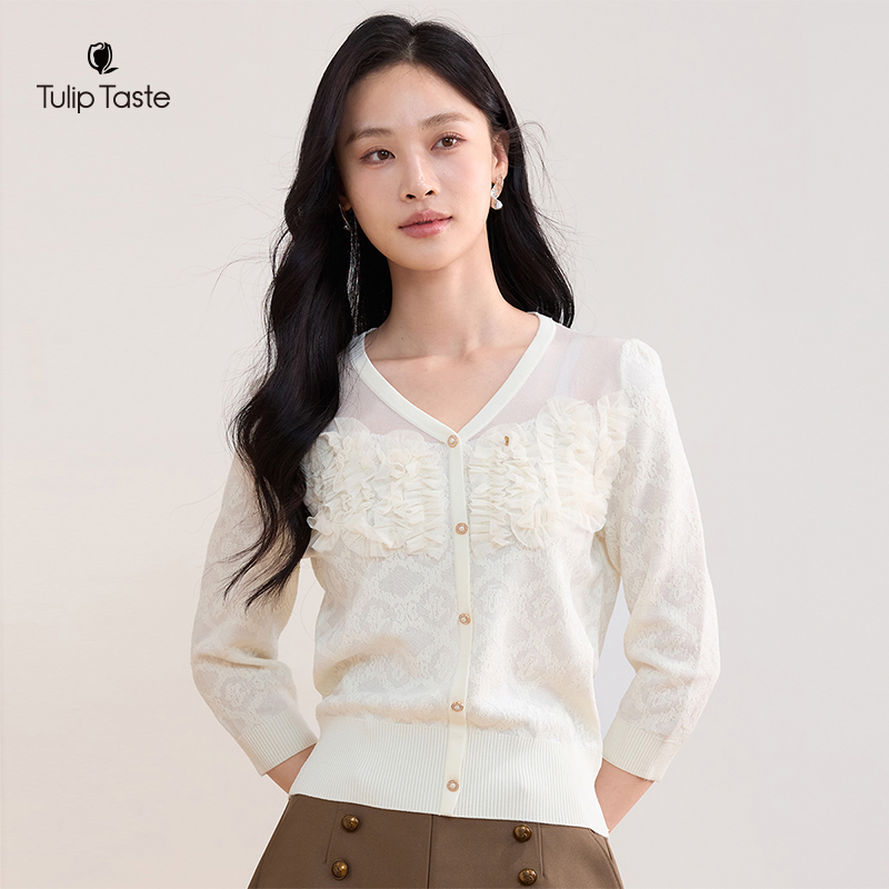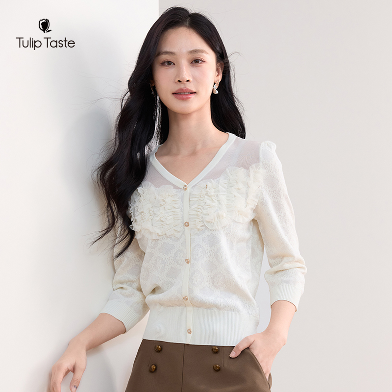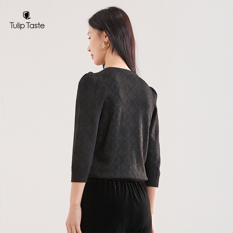 网纱设计套头七分袖 时尚 上衣 女气质通勤秋季 郁香菲提花V领针织衫