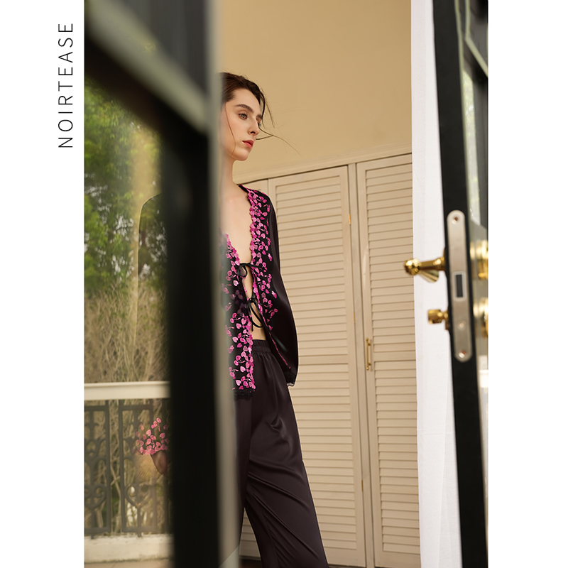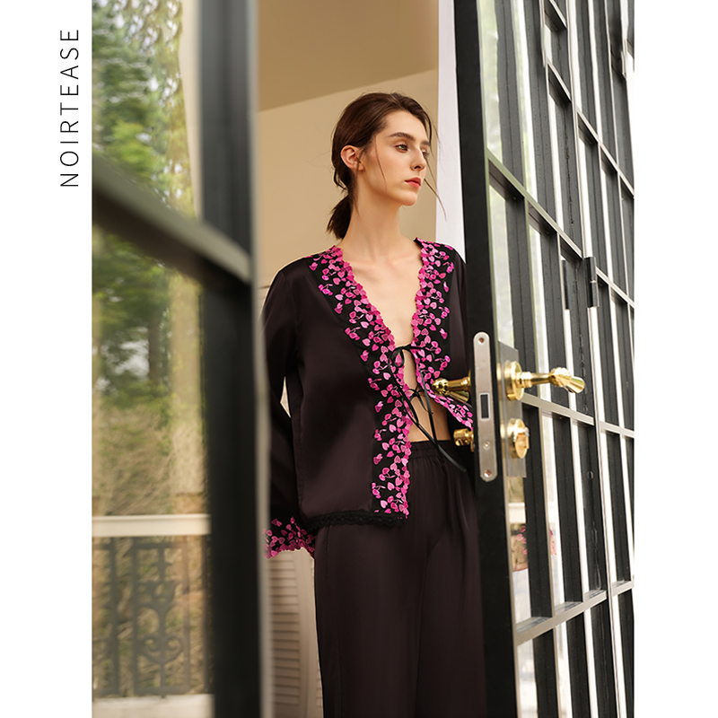 家居服两件套装 法式 丝质性感蕾丝睡衣女士长袖 NoirTease春秋薄款