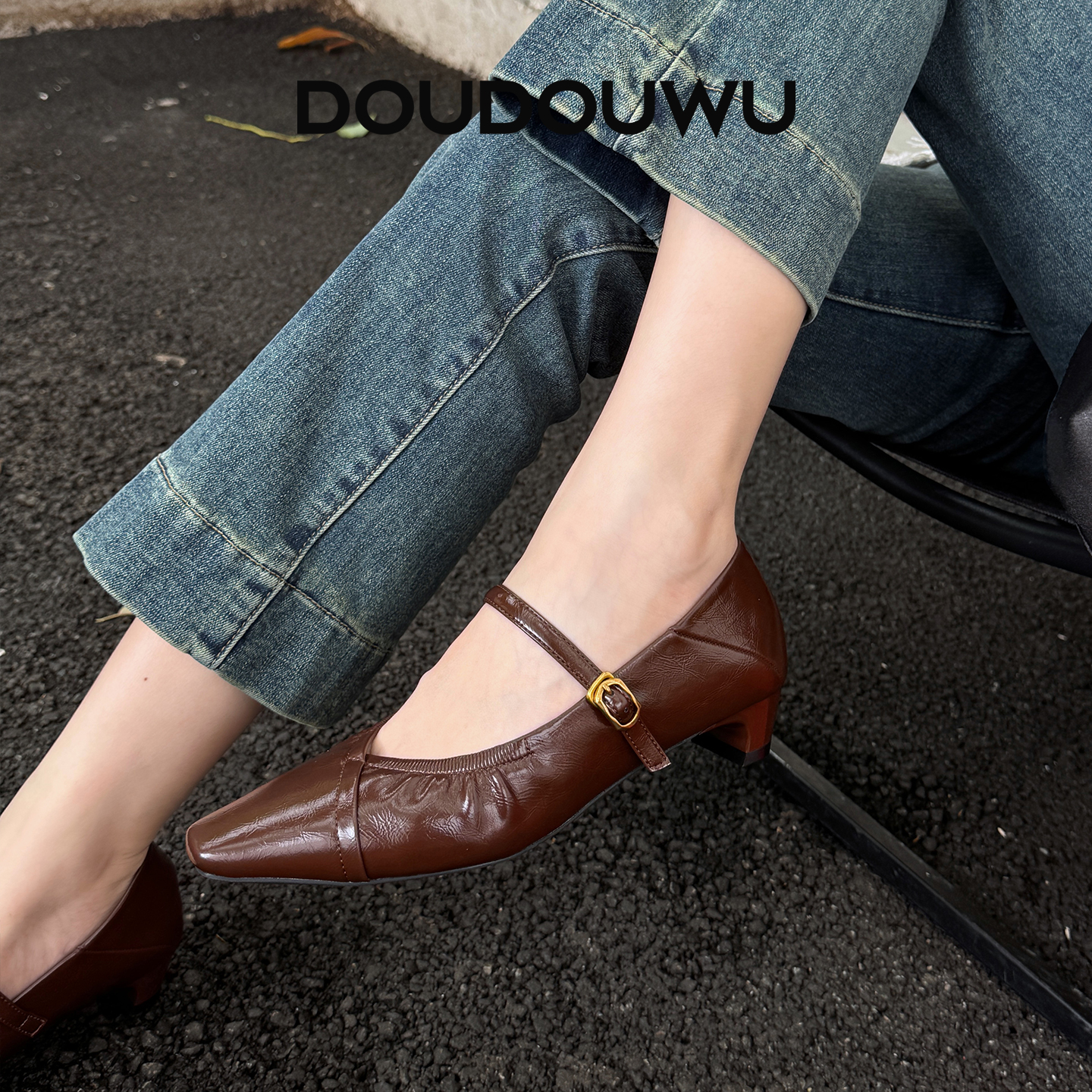 仙女风瓢鞋 秋季 浅口百搭中跟奶奶鞋 大码 真皮单鞋 女鞋 粗跟2025新款