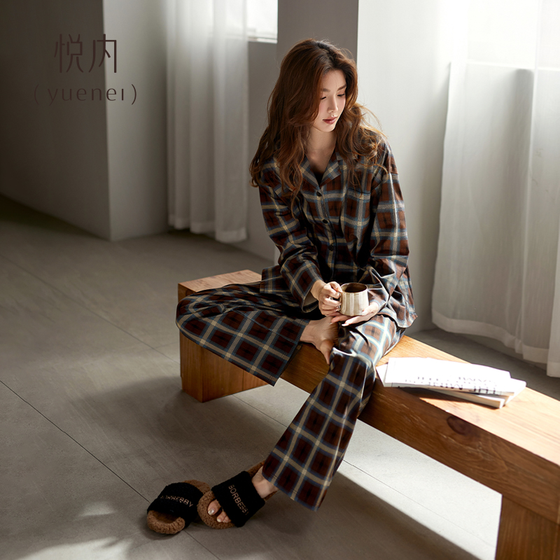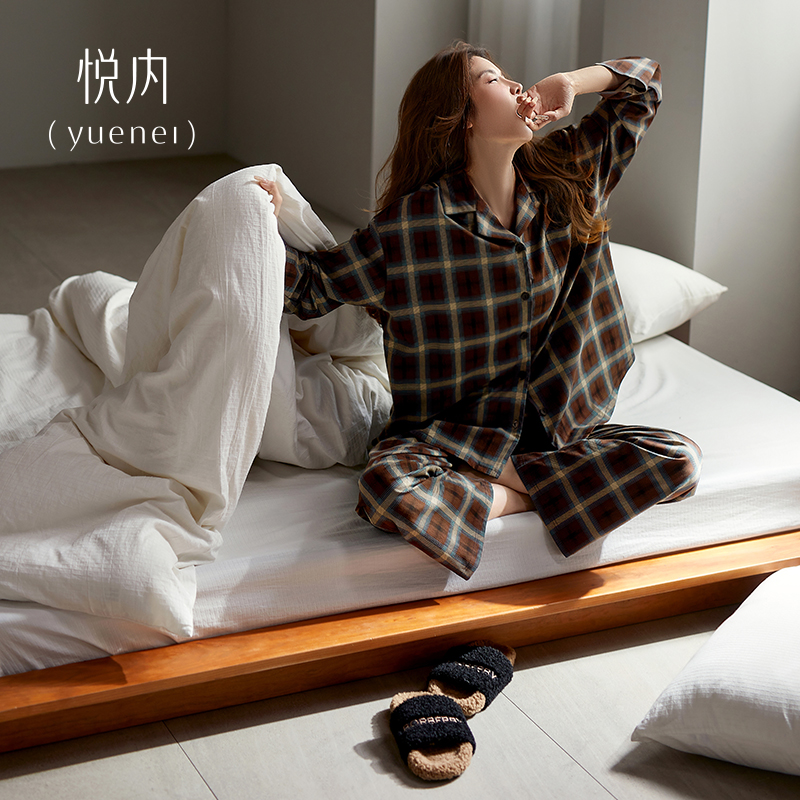 秋款 格子套装 秋天纯棉长袖 家居服休闲开衫 大码 悦内睡衣女士春秋季