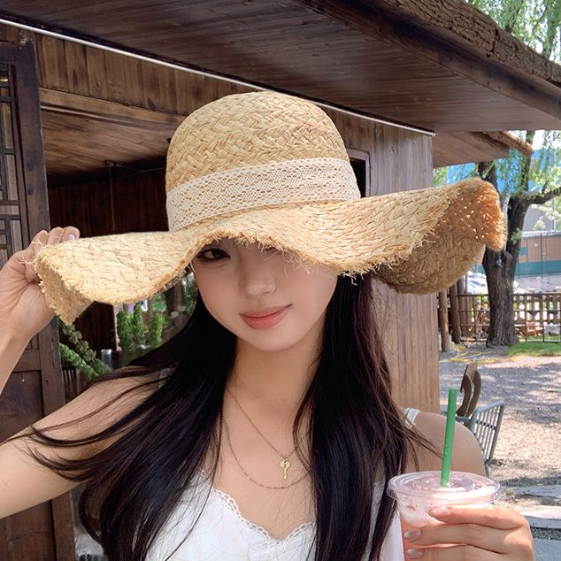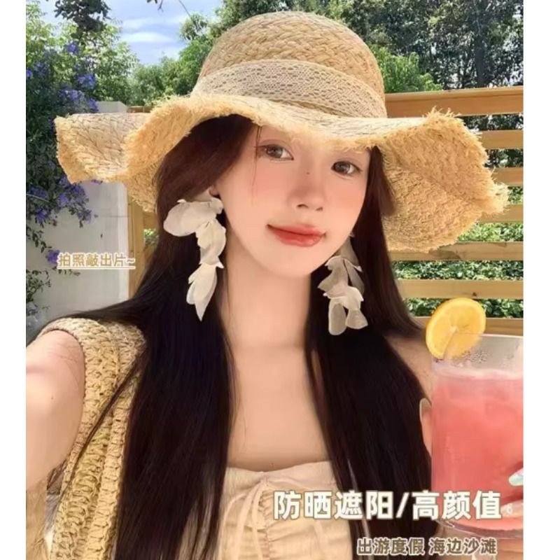 蕾丝花边法式 海边度假沙滩编织帽檐遮阳帽防晒帽子 蝴蝶结草帽夏季