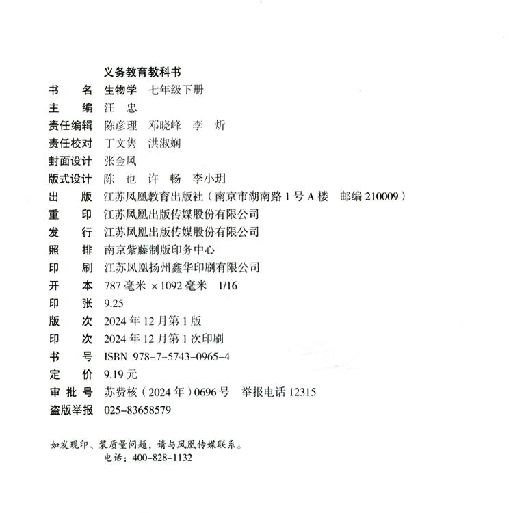 七年级下册 7下 江苏凤凰教育出版 初中生物学 社XGX 苏教版 生物学 初中生用书 2025年春 中学课本