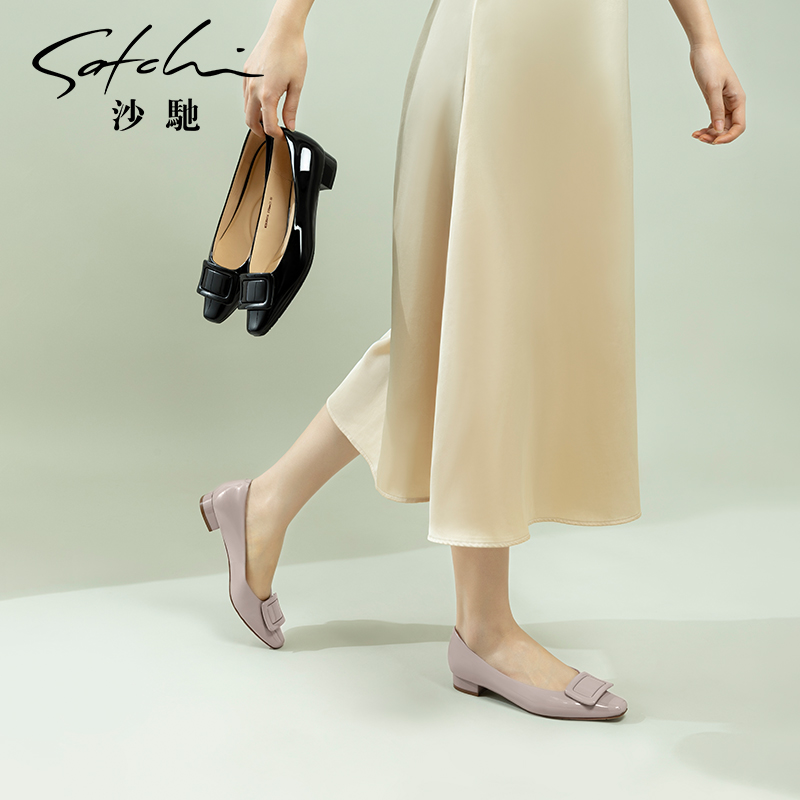 新款 女25年秋季 时尚 方扣浅口职业鞋 沙驰女鞋 晚晚风鞋 真皮低跟单鞋