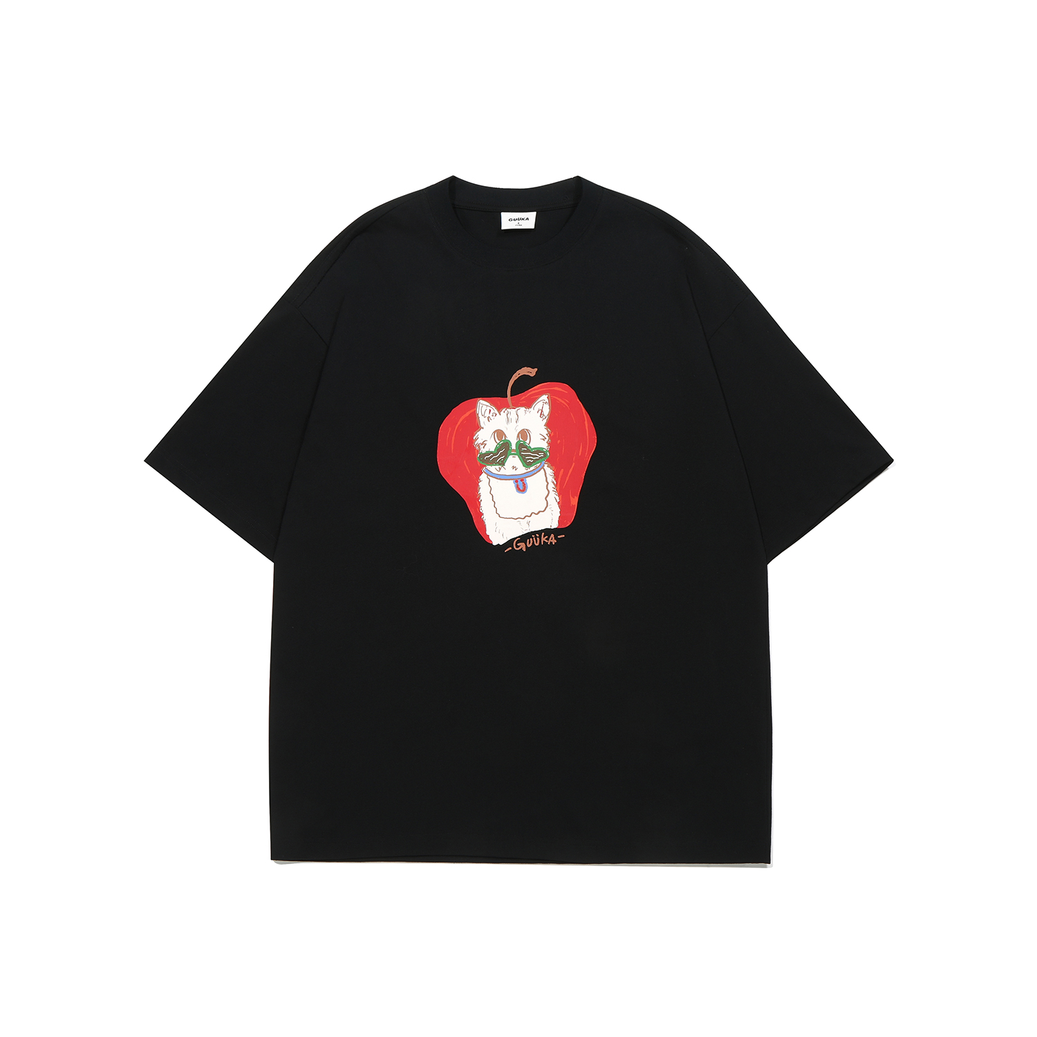 蒙恩同款 T恤男重磅纯棉黑色落肩上衣女宽松 GUUKA潮牌苹果猫咪短袖