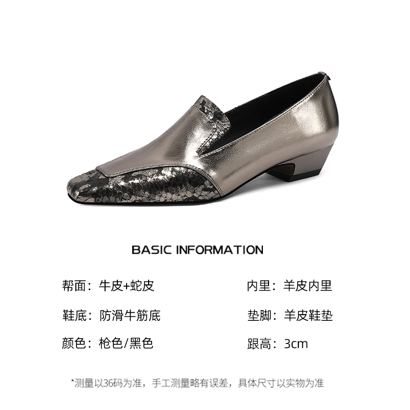 女真皮深口单鞋 春季 方头低跟乐福鞋 气质蛇皮拼接一脚蹬小皮鞋 新款