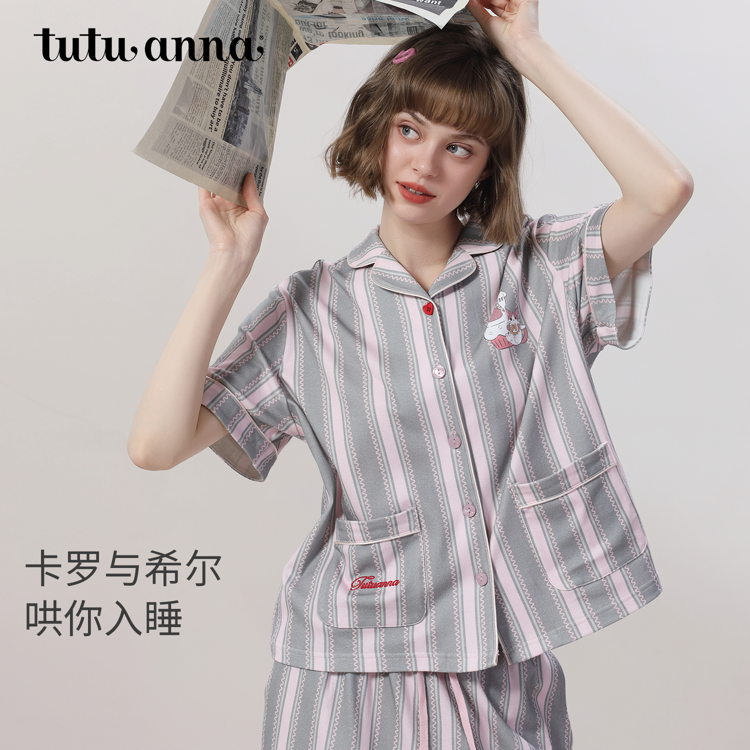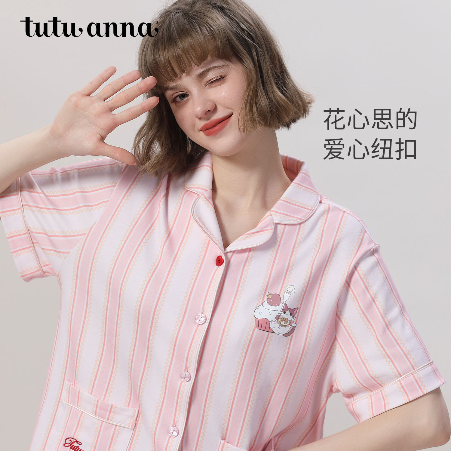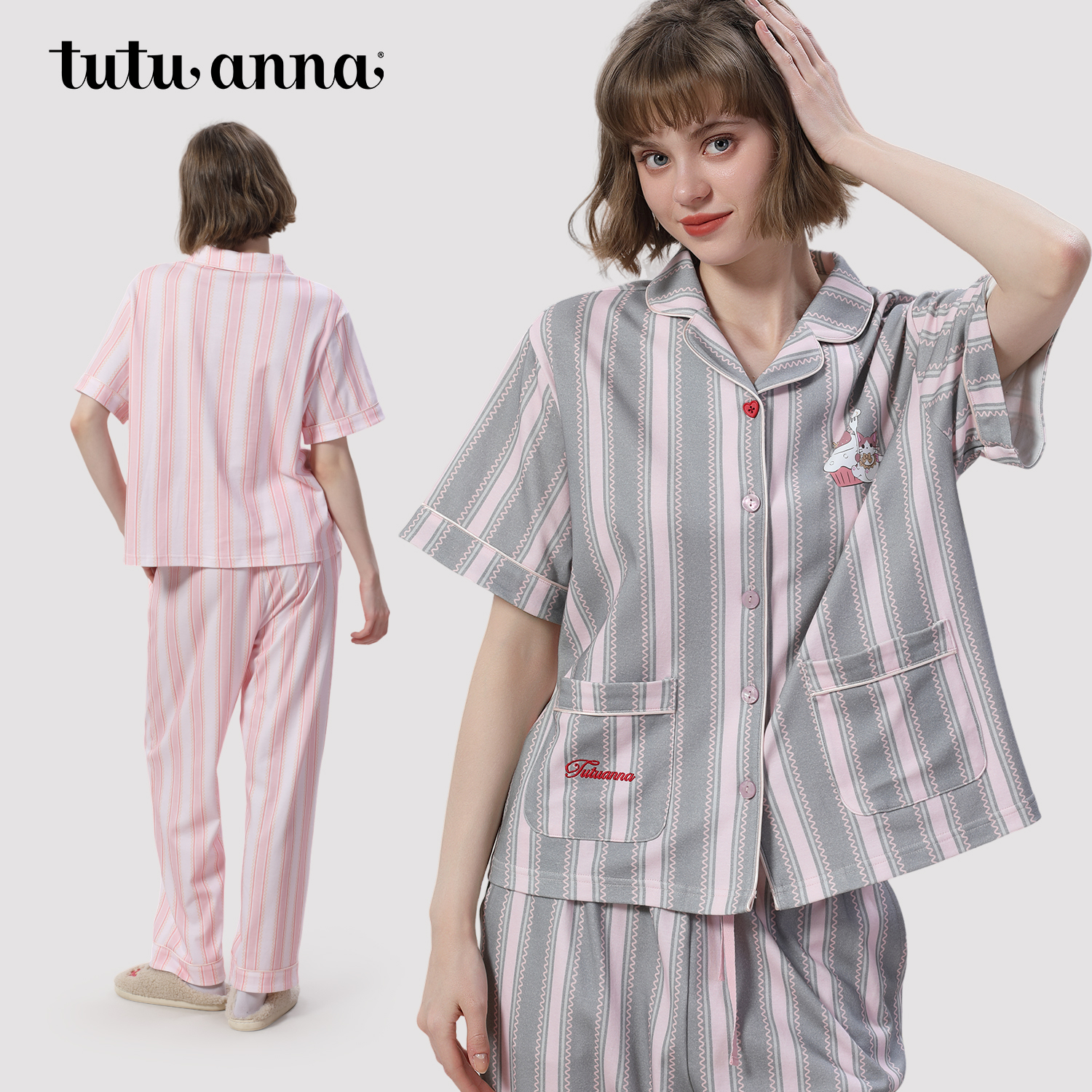 2025新 家居服套装 tutuanna睡衣女款 夏全棉竖条纹卡印花前扣短袖