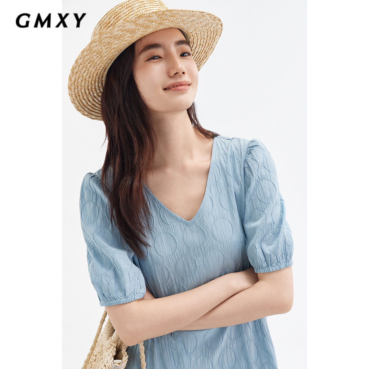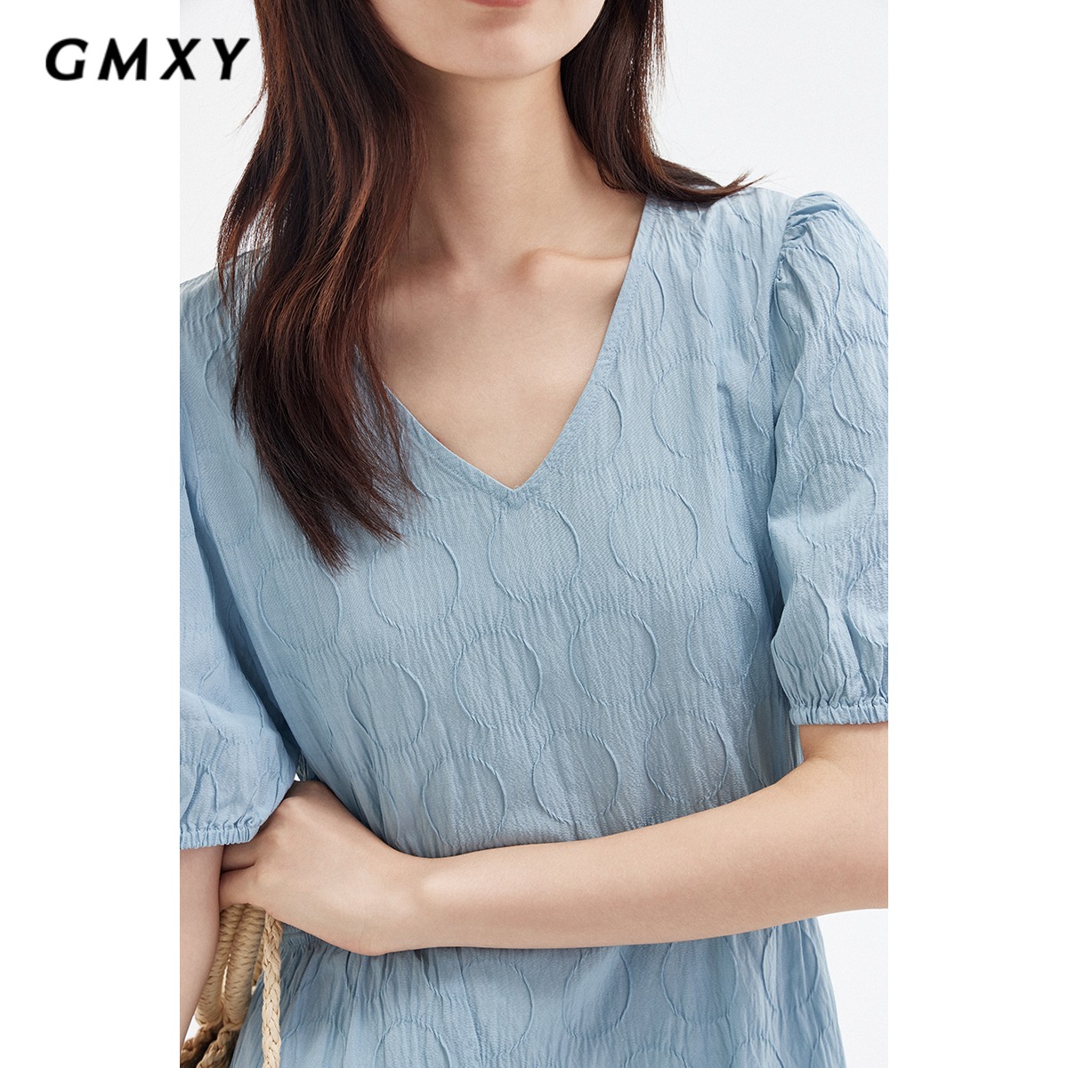 古木夕羊通勤纯色V领连衣裙女夏季 拼接设计感减龄中长裙GS3301841