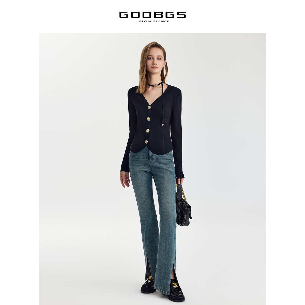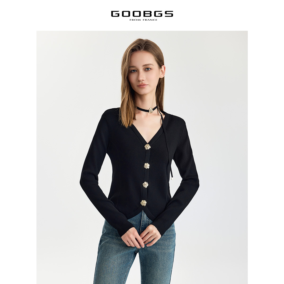 上衣女2025秋季 针织衫 新款 长袖 V领设计感法式 谷邦黑色小香风毛衫
