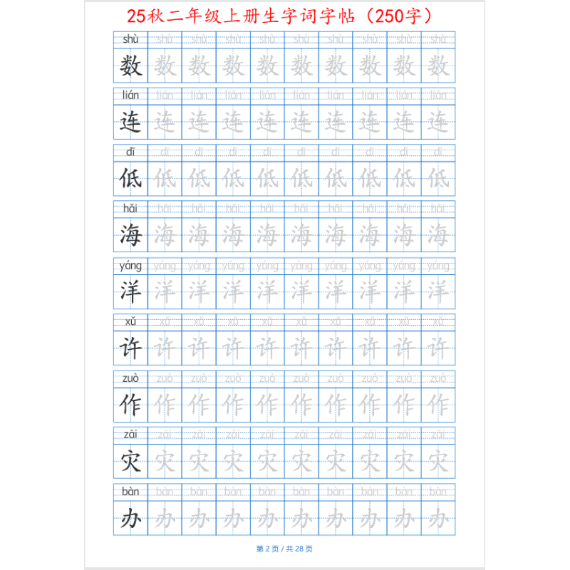 小学语文写字表生字同步练习生字拼音练字贴每日打卡一二三年级上册生字练字帖BT款 二年级上册课本同步写字表字贴2025新款 部编版